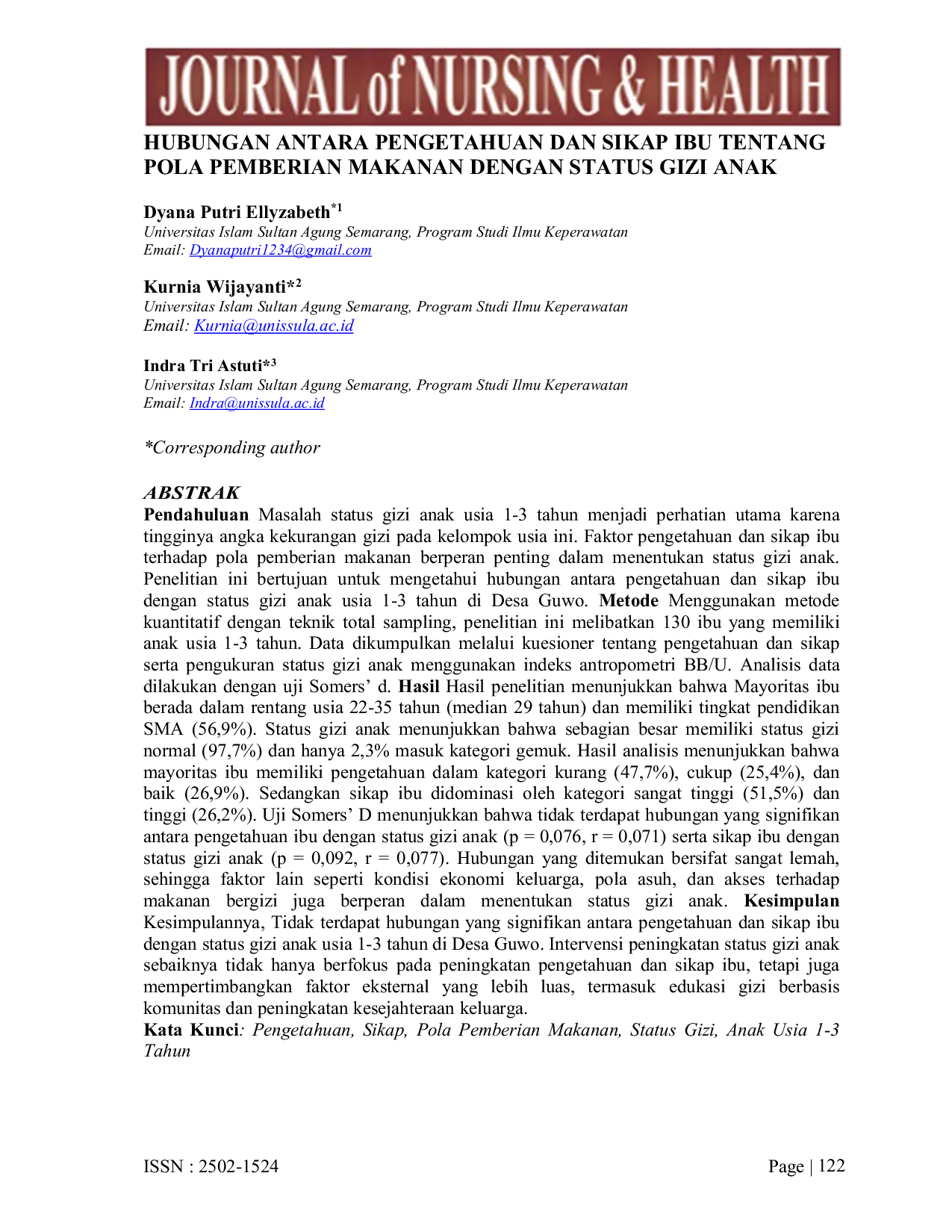 Journal of Nursing and HealthJournal of Nursing and HealthPendahuluan Masalah status gizi anak usia 1-3 tahun menjadi perhatian utama karena tingginya angka kekurangan gizi pada kelompok usia ini. Faktor pengetahuan dan sikap ibu terhadap pola pemberian makanan berperan penting dalam menentukan status gizi anak. Penelitian ini bertujuan untuk mengetahui hubungan antara pengetahuan dan sikap ibu dengan status gizi anak usia 1-3 tahun di Desa Guwo. Metode Menggunakan metode kuantitatif dengan teknik total sampling, penelitian ini melibatkan 130 ibu yang memiliki anak usia 1-3 tahun. Data dikumpulkan melalui kuesioner tentang pengetahuan dan sikap serta pengukuran status gizi anak menggunakan indeks antropometri BB/U. Analisis data dilakukan dengan uji Somers d. Hasil Hasil penelitian menunjukkan bahwa Mayoritas ibu berada dalam rentang usia 22-35 tahun (median 29 tahun) dan memiliki tingkat pendidikan SMA (56,9%). Status gizi anak menunjukkan bahwa sebagian besar memiliki status gizi normal (97,7%) dan hanya 2,3% masuk kategori gemuk. Hasil analisis menunjukkan bahwa mayoritas ibu memiliki pengetahuan dalam kategori kurang (47,7%), cukup (25,4%), dan baik (26,9%). Sedangkan sikap ibu didominasi oleh kategori sangat tinggi (51,5%) dan tinggi (26,2%). Uji Somers D menunjukkan bahwa tidak terdapat hubungan yang signifikan antara pengetahuan ibu dengan status gizi anak (p = 0,076, r = 0,071) serta sikap ibu dengan status gizi anak (p = 0,092, r = 0,077). Hubungan yang ditemukan bersifat sangat lemah, sehingga faktor lain seperti kondisi ekonomi keluarga, pola asuh, dan akses terhadap juga berperan dalam menentukan status gizi anak.
