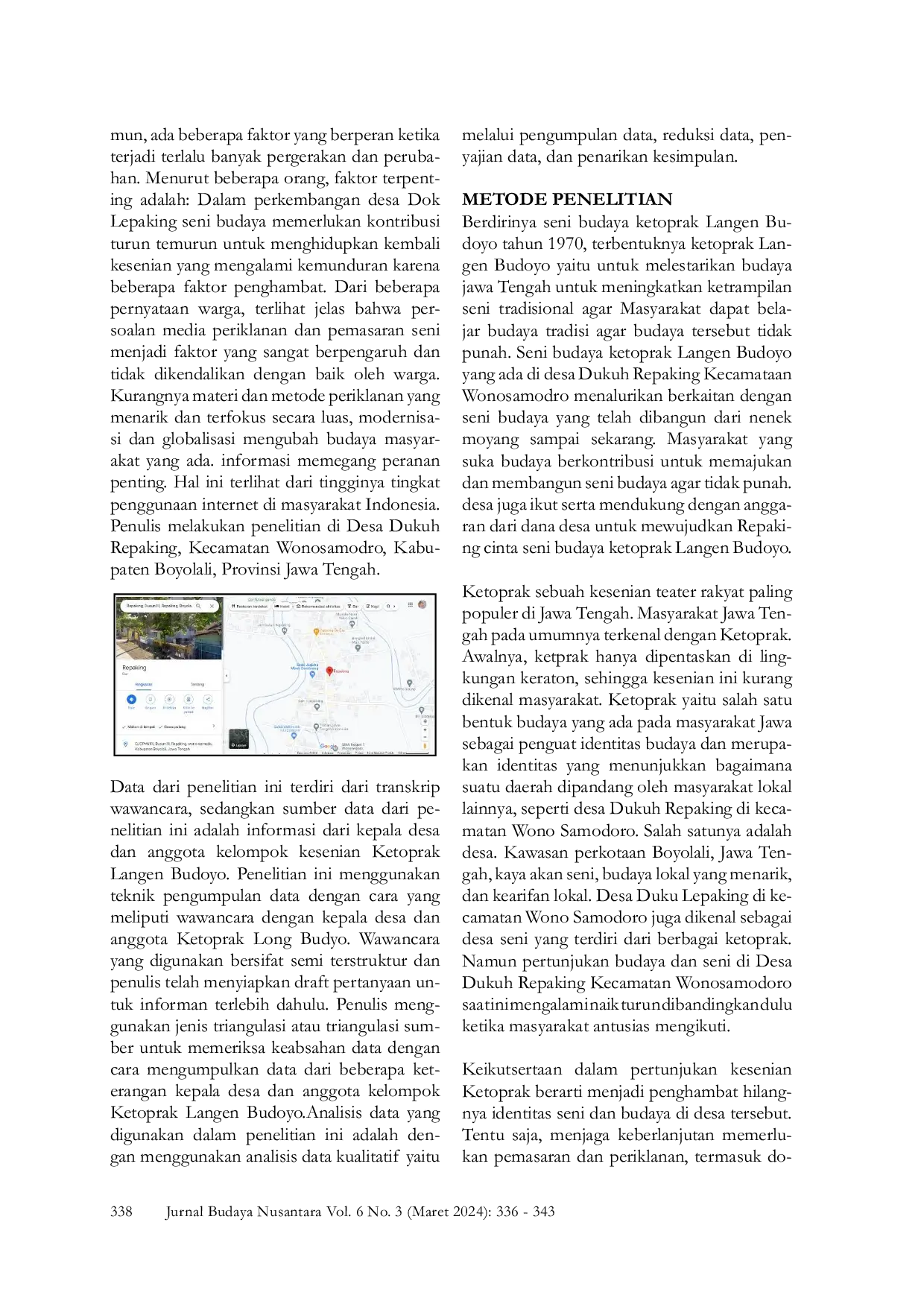 Jurnal Budaya NusantaraJurnal Budaya NusantaraPenelitian ini menunjukkan bagaimana seni tradisional Ketoprak Langen Budoyo sebagai upaya melestarikan budaya lokal masyarakat Dukuh Repaking. Latar belakangnya adalah kondisi masyarakat yang memiliki potensi seni dan budaya tetapi belum dikembangkan secara maksimal sehingga diperlukan inovasi baru. Penelitian menggunakan metode deskriptif kualitatif dengan desain studi kasus. Teknik pengumpulan data melalui observasi langsung di lapangan, yaitu di Desa Dukuh Repaking, dan wawancara dengan anggota kelompok seni Ketoprak Langen Budoyo serta pemimpin desa yang mengetahui keberadaan seni dan budaya di Dukuh Repaking. Hasil penelitian menunjukkan bahwa pembentukan Ketoprak Langen Budoyo sangat diperlukan dalam upaya melestarikan seni dan budaya masyarakat, khususnya di Desa Dukuh Repaking. Pembentukan kelompok seni ketoprak sangat bermanfaat untuk keberlanjutan seni budaya ketoprak. Hingga saat ini, seni Langen Budoyo Ketoprak masih ada di masyarakat, tetapi karena belum dikembangkan secara maksimal, dikhawatirkan akan hilang jika tidak dilestarikan. Pembentukan kelompok seni ketoprak sangat penting untuk mendukung pelestarian seni dan budaya serta meningkatkan pendapatan masyarakat.