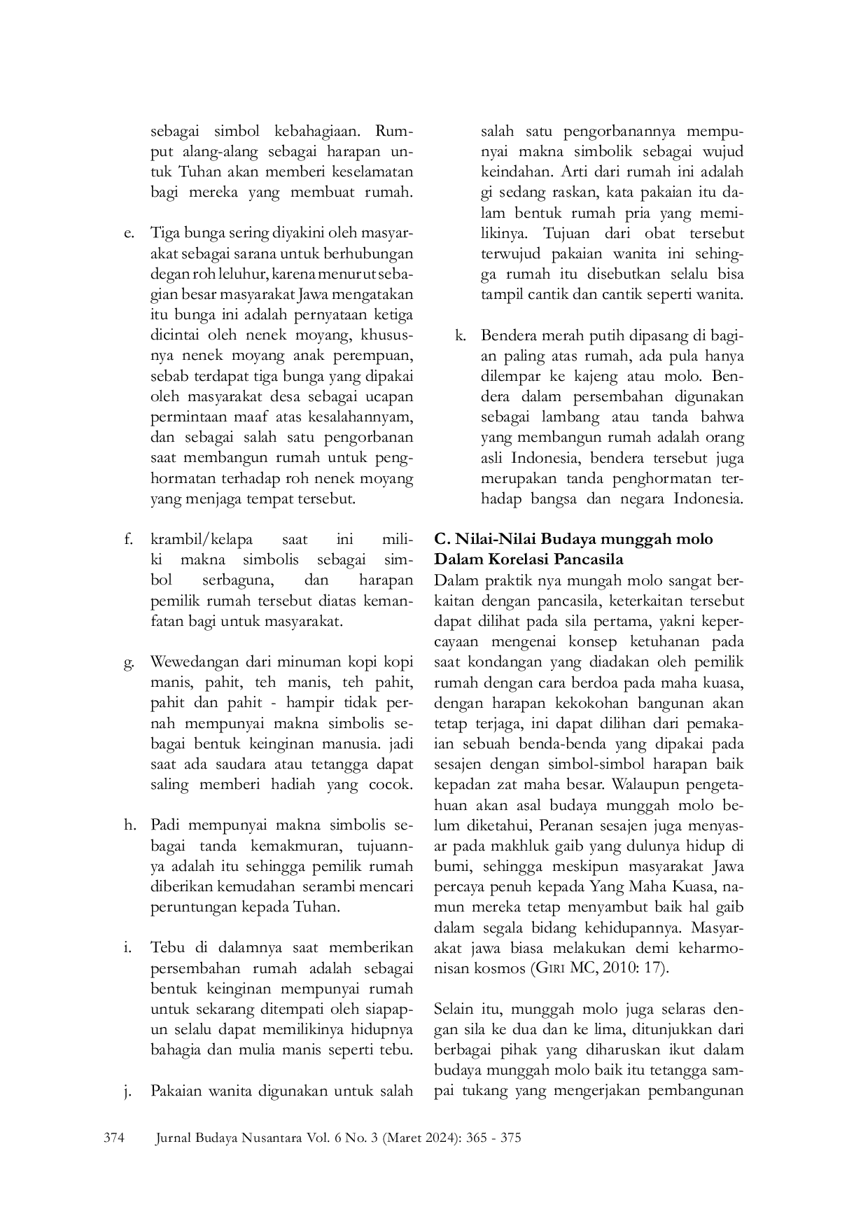 Jurnal Budaya NusantaraJurnal Budaya NusantaraPenelitian ini berfokus pada budaya Munggah Molo dalam budaya Jawa saat membangun rumah. Tujuannya adalah untuk mengungkap salah satu budaya yang masih bertahan hingga saat ini, dengan menganalisis nilai-nilai budaya yang terkandung dalam Munggah Molo dan korelasinya dengan Pancasila. Praktik budaya ini mencerminkan nilai-nilai Pancasila seperti kepercayaan kepada Tuhan Yang Maha Esa, persatuan Indonesia, keadilan dan kemanusiaan yang adil dan beradab, demokrasi, dan kesejahteraan sosial. Budaya ini juga menunjukkan kepedulian terhadap semua pihak yang terlibat serta penghormatan terhadap identitas budaya dan nasional. Munggah Molo memiliki makna tentang kontinuitas antara manusia dan harapan untuk memiliki kebaikan di dalam rumah. Oleh karena itu, Munggah Molo bukan hanya sebuah ritual, tetapi mengandung makna yang dalam tentang hubungan leluhur, kehidupan sosial yang harmonis, dan penghormatan terhadap nilai-nilai budaya dan nasional.