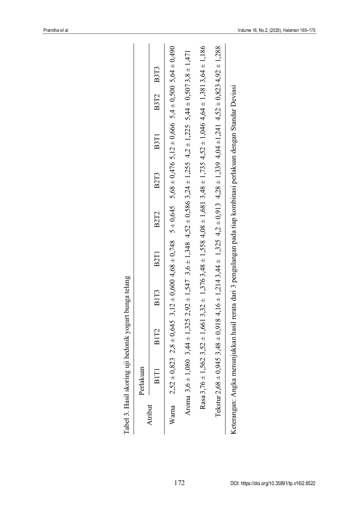 Kombinasi konsentrasi ekstrak bunga telang dan lama fermentasi berpengaruh nyata terhadap warna, aroma, rasa, dan tekstur yogurt bunga telang.Perlakuan B3T3 (3% ekstrak, fermentasi 12 jam) menghasilkan skor tertinggi pada seluruh atribut sensoris.Warna lebih intens akibat stabilitas antosianin pada pH rendah, aroma kompleks terbentuk dari interaksi senyawa volatil fermentasi dan ekstrak bunga telang, serta rasa asam-manis seimbang yang disukai.Tekstur yang lebih kental dan stabil juga diperoleh melalui interaksi protein susu dan senyawa aktif bunga telang.Kombinasi perlakuan B3T3 direkomendasikan sebagai terbaik dalam pengembangan formulasi yogurt susu kambing Etawa berbasis bunga telang.