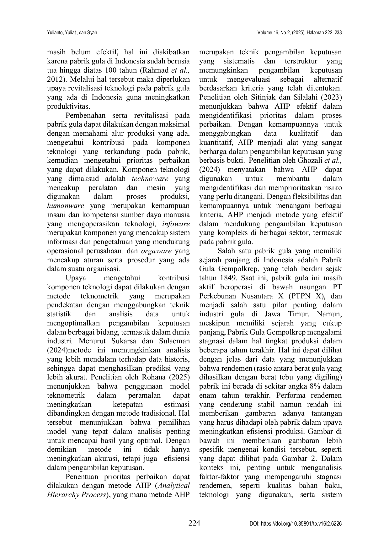 Teknologi Pangan : Media Informasi dan Komunikasi Ilmiah Teknologi PertanianTeknologi Pangan : Media Informasi dan Komunikasi Ilmiah Teknologi PertanianIndustri gula di Indonesia memegang peranan penting dalam mendukung ketahanan pangan nasional. Pabrik gula sebagai salah satu sektor vital tidak hanya memproduksi gula untuk konsumsi dalam negeri, namun juga berkontribusi pada perekonomian lokal dan sektor pertanian, khususnya tebu. Pabrik Gula Gempolkrep yang telah beroperasi sejak tahun 1849 merupakan salah satu pabrik gula yang menghadapi tantangan dalam hal peningkatan rendemen, terlihat dari stagnasi rendemen sekitar 8% dalam 6 tahun terakhir. Penelitian ini bertujuan untuk menganalisis kondisi proses produksi gula, mengidentifikasi kontribusi teknologi terhadap produksi, dan menentukan prioritas perbaikan yang diperlukan di Pabrik Gula Gempolkrep. Metode penelitian yang digunakan adalah metode deskriptif untuk menggambarkan proses produksi, metode teknometrik untuk menilai kontribusi teknologi, dan metode AHP (Analytical Hierarchy Process) untuk menentukan prioritas perbaikan.