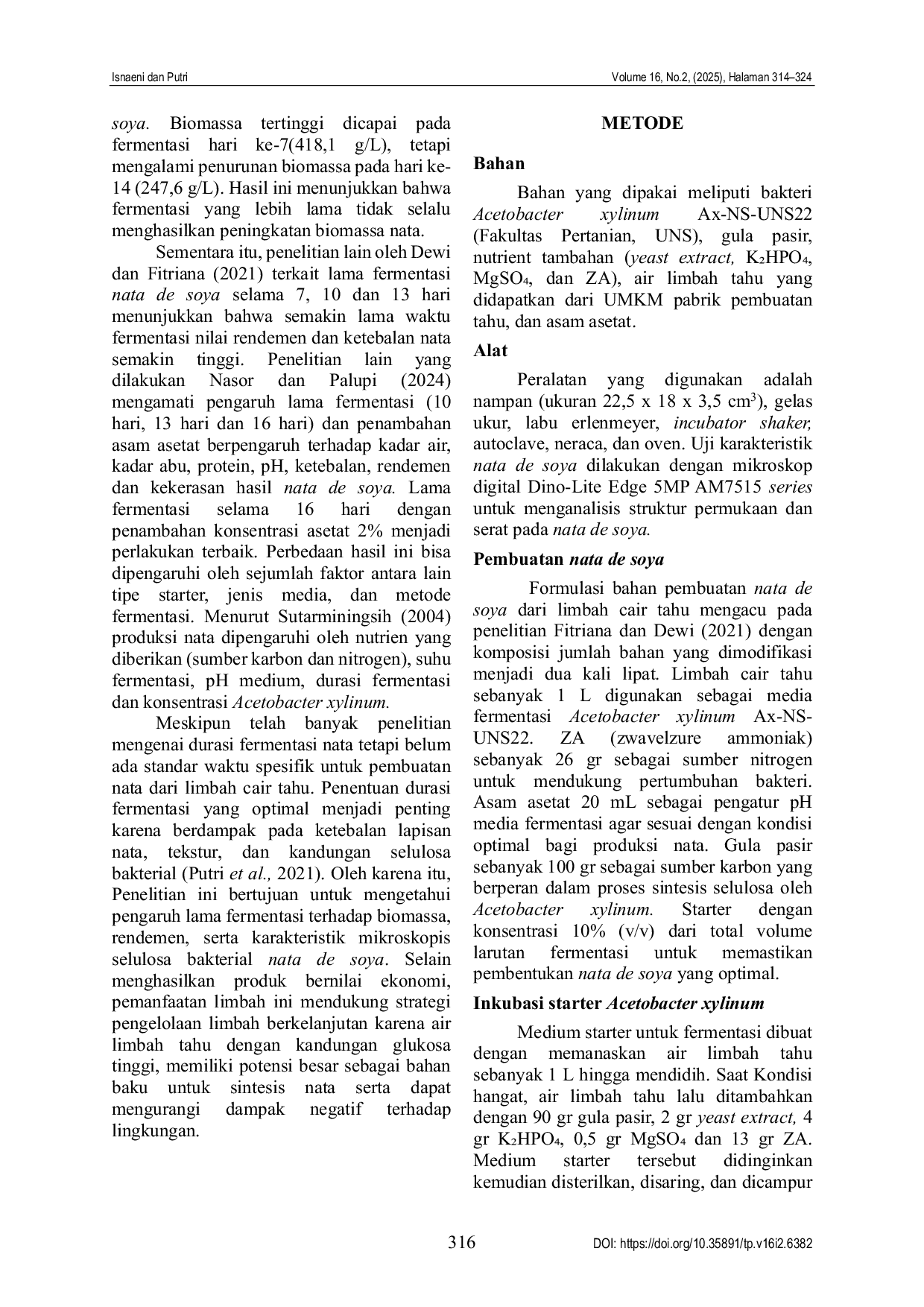 Durasi fermentasi memengaruhi biomassa, rendemen, dan karakteristik mikroskopis selulosa bakterial nata de soya.Fermentasi optimal berada pada rentang 18–24 hari menghasilkan biomassa tinggi, rendemen stabil, dan serat selulosa yang rapat serta teratur.Fermentasi selama 30 hari meningkatkan rendemen kering namun menyebabkan degradasi struktur serat, menunjukkan bahwa durasi tidak hanya menentukan kuantitas tetapi juga kualitas selulosa.