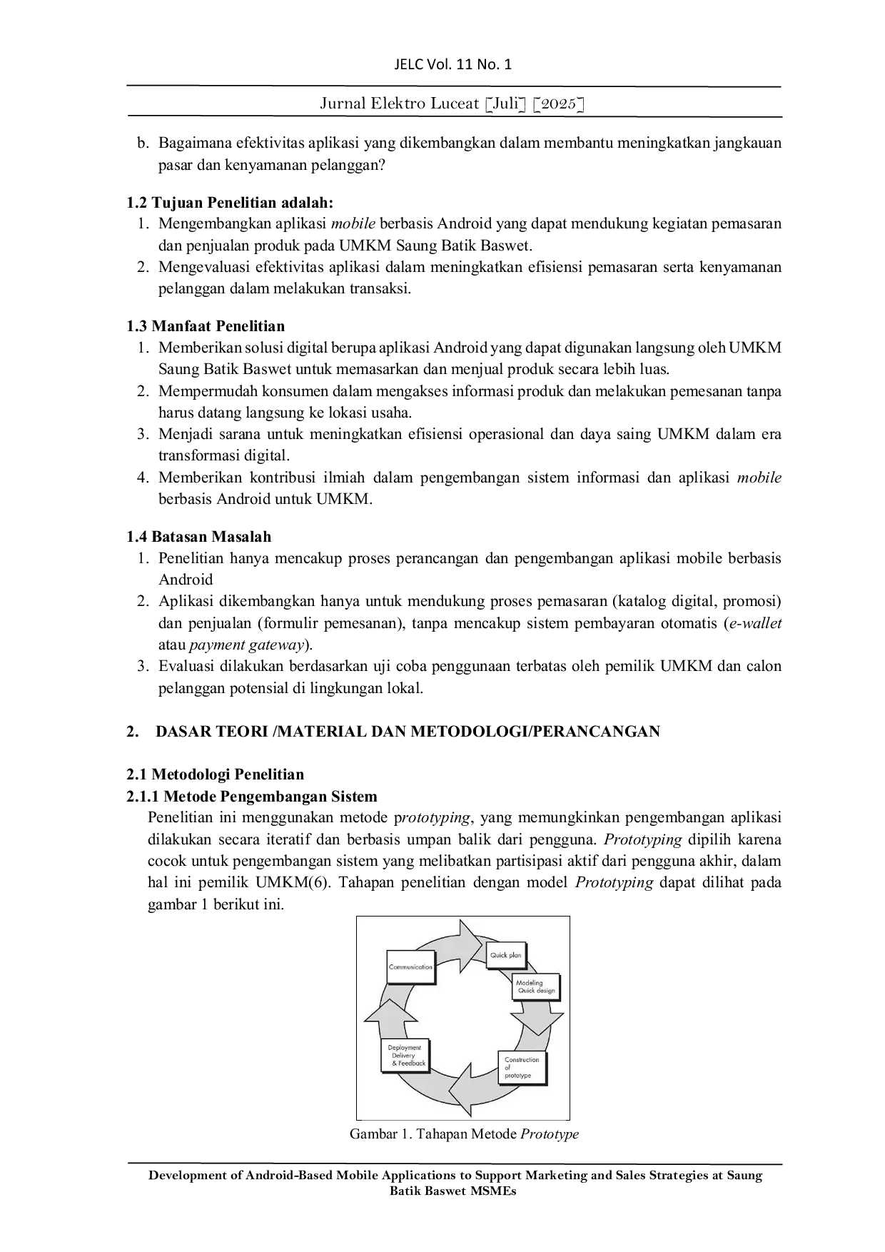Electro LuceatElectro LuceatSalah satu sektor UMKM yang memiliki potensi tinggi untuk berkembang adalah industri kerajinan batik. Saung Batik Baswet merupakan salah satu UMKM yang bergerak dalam produksi dan penjualan batik khas lokal di Kabupaten Banyumas dengan berupaya melestarikan warisan budaya sekaligus menciptakan nilai ekonomi. Pemasaran yang dilakukan Saung Batik Baswet masih dilakukan secara konvensional, yaitu masih terbatas pada sosial media WhatsApp, Instagram dan relasi antar relasi, pertemanan, dan lingkungan kerabat serta promosi dari mulut ke mulut. Tujuan penelitian yaitu mengembangkan aplikasi mobile berbasis Android yang dapat mendukung kegiatan pemasaran dan penjualan produk pada UMKM Saung Batik Baswet dan mengevaluasi efektivitas aplikasi dalam meningkatkan efisiensi pemasaran serta kenyamanan pelanggan dalam melakukan transaksi. Penelitian menggunakan metode prototyping yang memungkinkan pengembangan aplikasi dilakukan secara iteratif dan berbasis umpan balik dari pengguna. Hasil penelitian dengan Paired Samples Test menyimpulkan bahwa H0 ditolak dan H1 diterima karena nilai Sig. yang diperoleh adalah 0,00 yang artinya nilai Sig. kurang dari 0,05. Sehingga terdapat perbedaan waktu yang signifikan saat memesan menu sebelum dan sesudah menggunakan Aplikasi mobile Android Saung Batik Baswet. Hasil ini menunjukkan bahwa aplikasi yang dikembangkan telah berhasil meningkatkan efisiensi dalam proses pemesanan, yang tentunya berkontribusi pada peningkatan pengalaman pelanggan dalam melakukan transaksi.