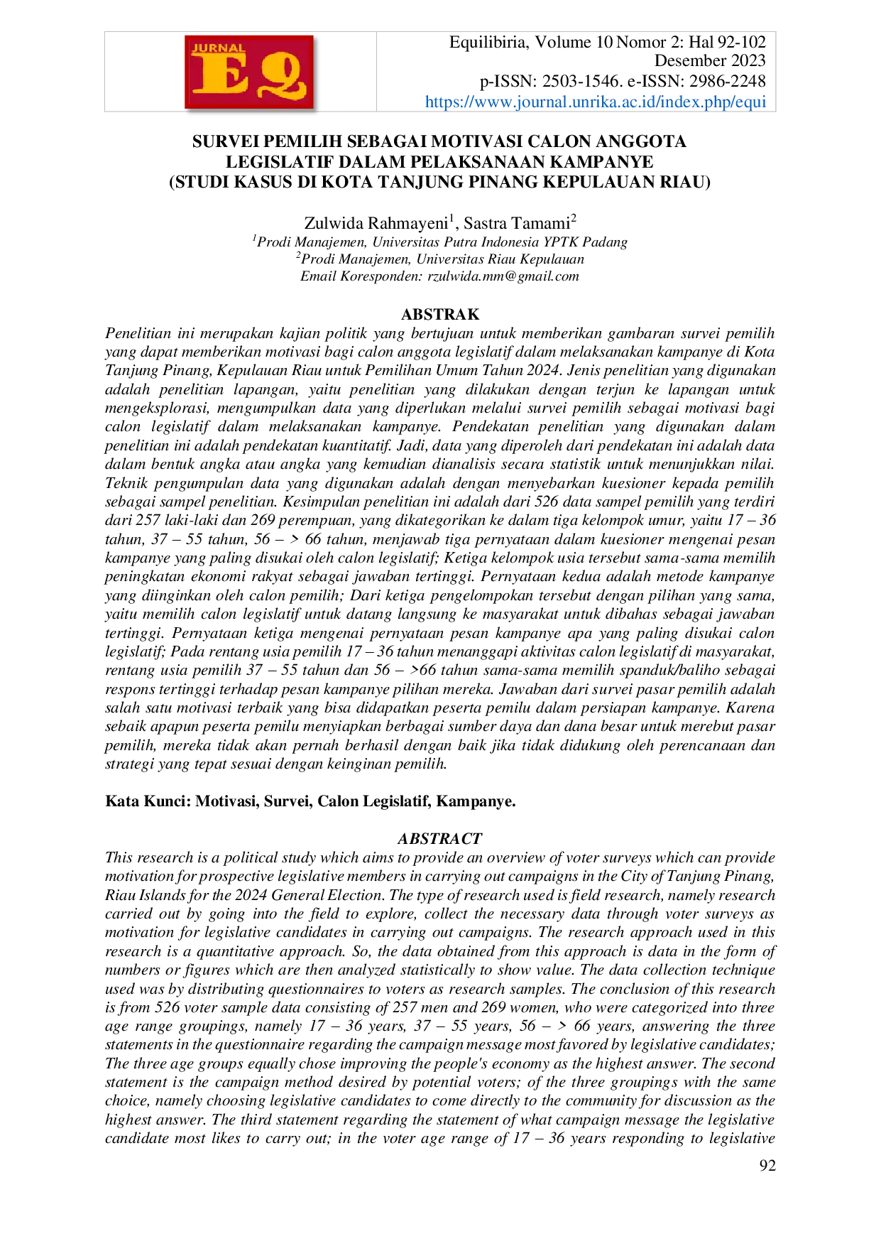 EQUILIBIRIA: Jurnal Fakultas EkonomiEQUILIBIRIA: Jurnal Fakultas EkonomiPenelitian ini merupakan kajian politik yang bertujuan untuk memberikan gambaran survei pemilih yang dapat memberikan motivasi bagi calon anggota legislatif dalam melaksanakan kampanye di Kota Tanjung Pinang, Kepulauan Riau untuk Pemilihan Umum Tahun 2024. Jenis penelitian yang digunakan adalah penelitian lapangan, yaitu penelitian yang dilakukan dengan terjun ke lapangan untuk mengeksplorasi, mengumpulkan data yang diperlukan melalui survei pemilih sebagai motivasi bagi calon legislatif dalam melaksanakan kampanye. Pendekatan penelitian yang digunakan dalam penelitian ini adalah pendekatan kuantitatif. Jadi, data yang diperoleh dari pendekatan ini adalah data dalam bentuk angka atau angka yang kemudian dianalisis secara statistik untuk menunjukkan nilai. Teknik pengumpulan data yang digunakan adalah dengan menyebarkan kuesioner kepada pemilih sebagai sampel penelitian. Kesimpulan penelitian ini adalah dari 526 data sampel pemilih yang terdiri dari 257 laki-laki dan 269 perempuan, yang dikategorikan ke dalam tiga kelompok umur, yaitu 17 – 36 tahun, 37 – 55 tahun, 56 – > 66 tahun, menjawab tiga pernyataan dalam kuesioner mengenai pesan kampanye yang paling disukai oleh calon legislatif; Ketiga kelompok usia tersebut sama-sama memilih peningkatan ekonomi rakyat sebagai jawaban tertinggi. Pernyataan kedua adalah metode kampanye yang diinginkan oleh calon pemilih; Dari ketiga pengelompokan tersebut dengan pilihan yang sama, yaitu memilih calon legislatif untuk datang langsung ke masyarakat untuk dibahas sebagai jawaban tertinggi. Pernyataan ketiga mengenai pernyataan pesan kampanye apa yang paling disukai calon legislatif; Pada rentang usia pemilih 17 – 36 tahun menanggapi aktivitas calon legislatif di masyarakat, rentang usia pemilih 37 – 55 tahun dan 56 – >66 tahun sama-sama memilih spanduk/baliho sebagai respons tertinggi terhadap pesan kampanye pilihan mereka. Jawaban dari survei pasar pemilih adalah salah satu motivasi terbaik yang bisa didapatkan peserta pemilu dalam persiapan kampanye. Karena sebaik apapun peserta pemilu menyiapkan berbagai sumber daya dan dana besar untuk merebut pasar pemilih, mereka tidak akan pernah berhasil dengan baik jika tidak didukung oleh perencanaan dan strategi yang tepat sesuai dengan keinginan pemilih.