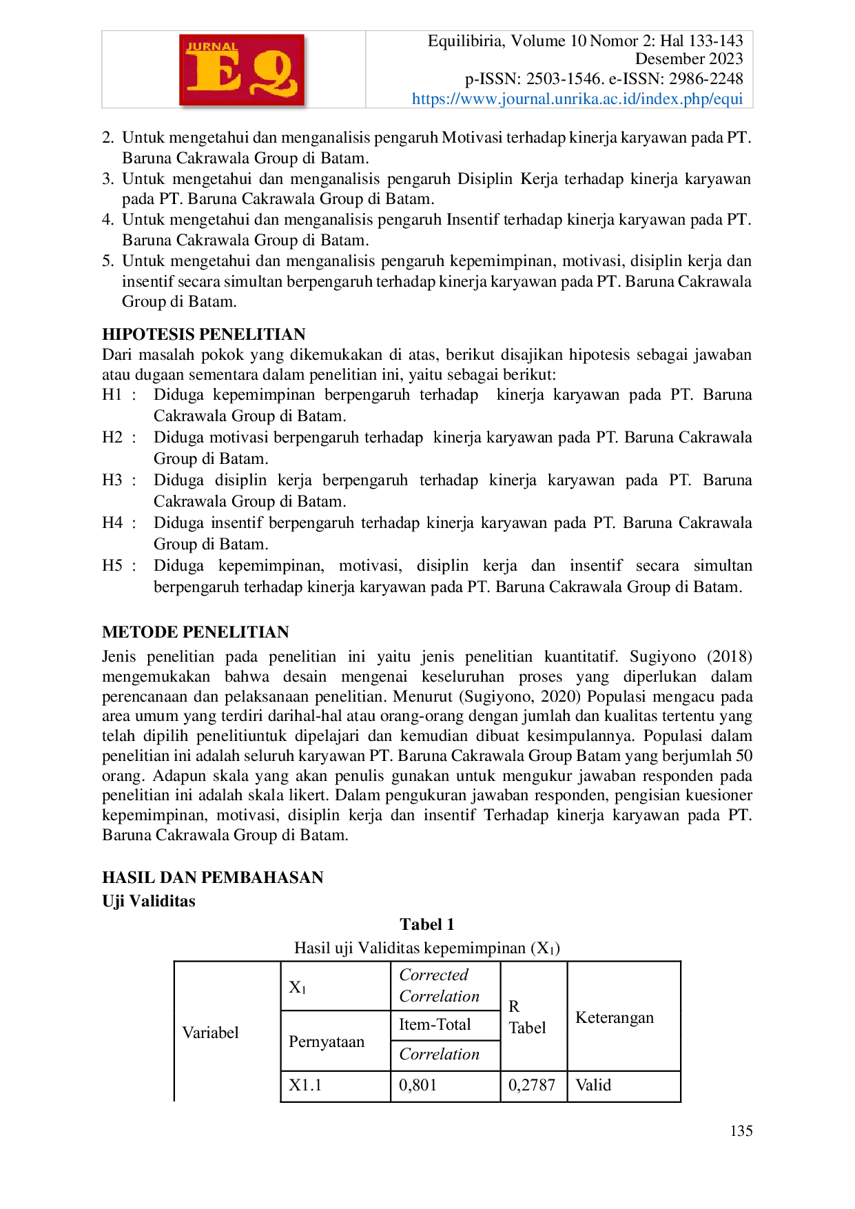 EQUILIBIRIA: Jurnal Fakultas EkonomiEQUILIBIRIA: Jurnal Fakultas EkonomiPenelitian ini bertujuan untuk mengetahui pengaruh kepemimpinan, motivasi, disiplin kerja, dan insentif terhadap kinerja karyawan PT. Baruna Cakrawala Group di Batam. Populasi penelitian ini adalah seluruh karyawan PT. Baruna Cakrawala Group di Batam yang berjumlah 50 orang, dengan teknik pengambilan sampel sensus. Penelitian ini menggunakan pendekatan kuantitatif dengan desain analisis deskriptif. Pengumpulan data dilakukan melalui penyebaran kuesioner melalui Google Form, dan analisis data menggunakan analisis regresi linear berganda. Hasil penelitian menunjukkan bahwa: 1) Kepemimpinan berpengaruh positif dan signifikan terhadap kinerja karyawan, 2) Motivasi berpengaruh positif dan signifikan terhadap kinerja karyawan, 3) Disiplin Kerja berpengaruh positif dan signifikan terhadap kinerja karyawan, 4) Insentif berpengaruh positif dan signifikan terhadap kinerja karyawan, dan 5) Kepemimpinan, Motivasi, Disiplin Kerja, dan Pemberian Insentif secara bersama-sama memiliki pengaruh signifikan terhadap kinerja karyawan PT. Baruna Cakrawala Group di Batam.