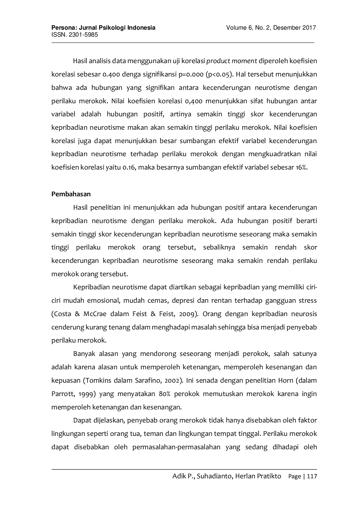 Persona:Jurnal Psikologi IndonesiaPersona:Jurnal Psikologi IndonesiaPenelitian ini bertujuan untuk mengetahui hubungan antara kecenderungan kepribadian neurotisme dengan perilaku merokok. Penelitian ini melibatkan 180 orang dewasa muda dengan rentang usia 20 hingga 40 tahun yang berperilaku merokok. Hasil analisis data menunjukkan bahwa terdapat hubungan yang positif dan sangat signifikan antara kecenderungan kepribadian neurotisme dengan perilaku merokok, dengan nilai p = 0,000 (p < 0,01) dan nilai koefisien korelasi r = 0,400. Artinya, semakin tinggi skor kecenderungan kepribadian neurotisme seseorang, semakin tinggi pula perilaku merokoknya.