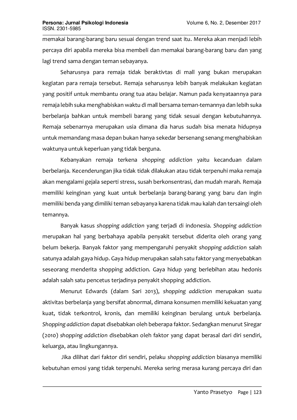 Berdasarkan penelitian yang telah dilakukan maka dapat disimpulkan beberapa hal berikut.1) terdapat hubungan antara gaya hidup dengan shopping addiction pada siswa Kelas 11 di SMA 17 Agustus 1945 Surabaya r xy = 0,662 p = 0,000 (sangat signifikan).2) Gaya hidup para remaja tergolong tinggi dengan rata-rata (mean) gaya hidup adalah 127,24 sedangkan Shoping Addiction para remaja juga tergolong tinggi dengan rata-rata (mean) shopping addiction adalah 65,29.