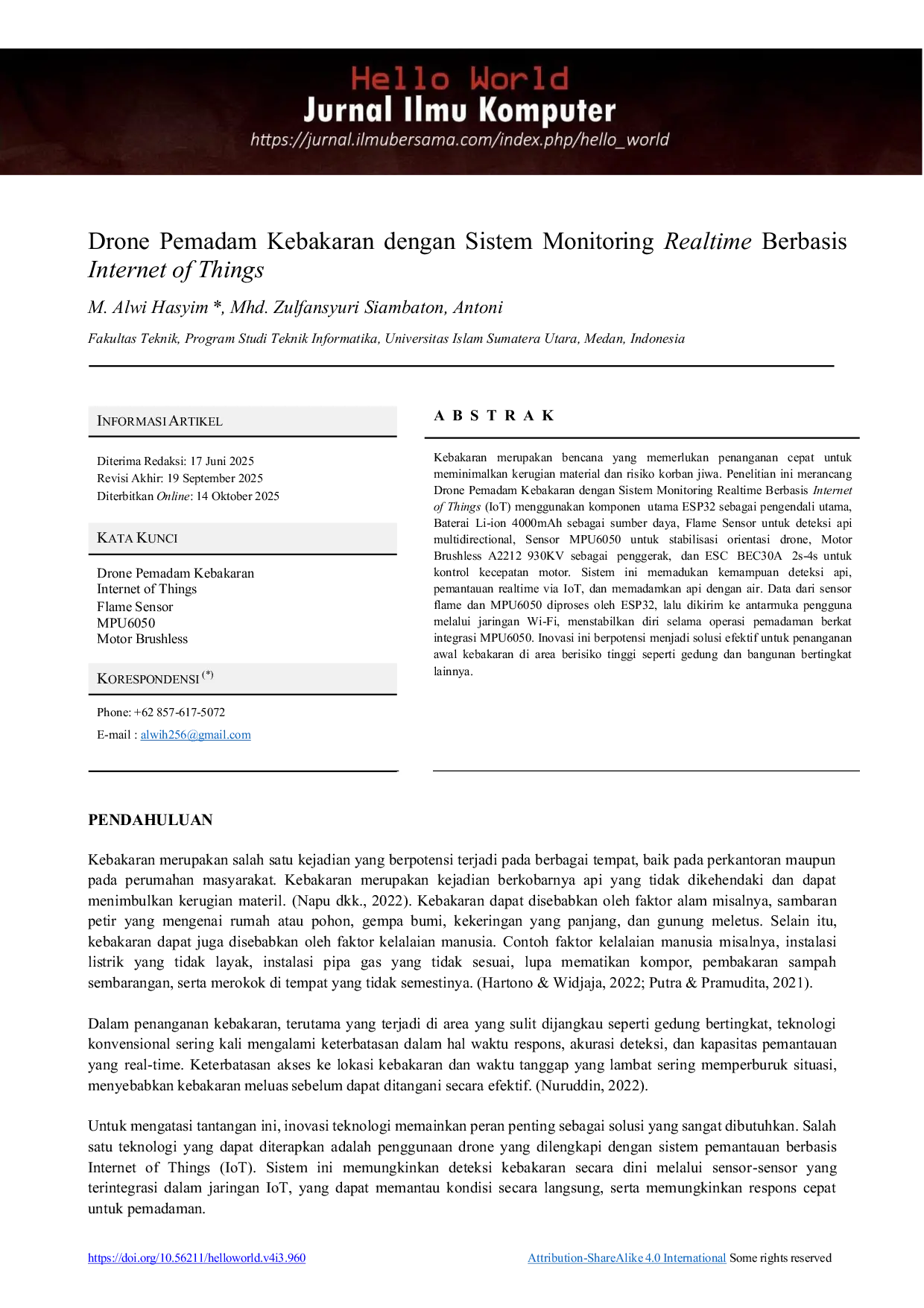 - Drone Pemadam Kebakaran dengan Sistem Monitoring Realtime Berbasis Internet of Things | Hello World Jurnal... doi.org/10.56211/helloworld.v4i3.960Drone Pemadam Kebakaran dengan Sistem Monitoring Realtime Berbasis Internet of Things Hello World Jurnal doi 10 56211 helloworld v4i3 960