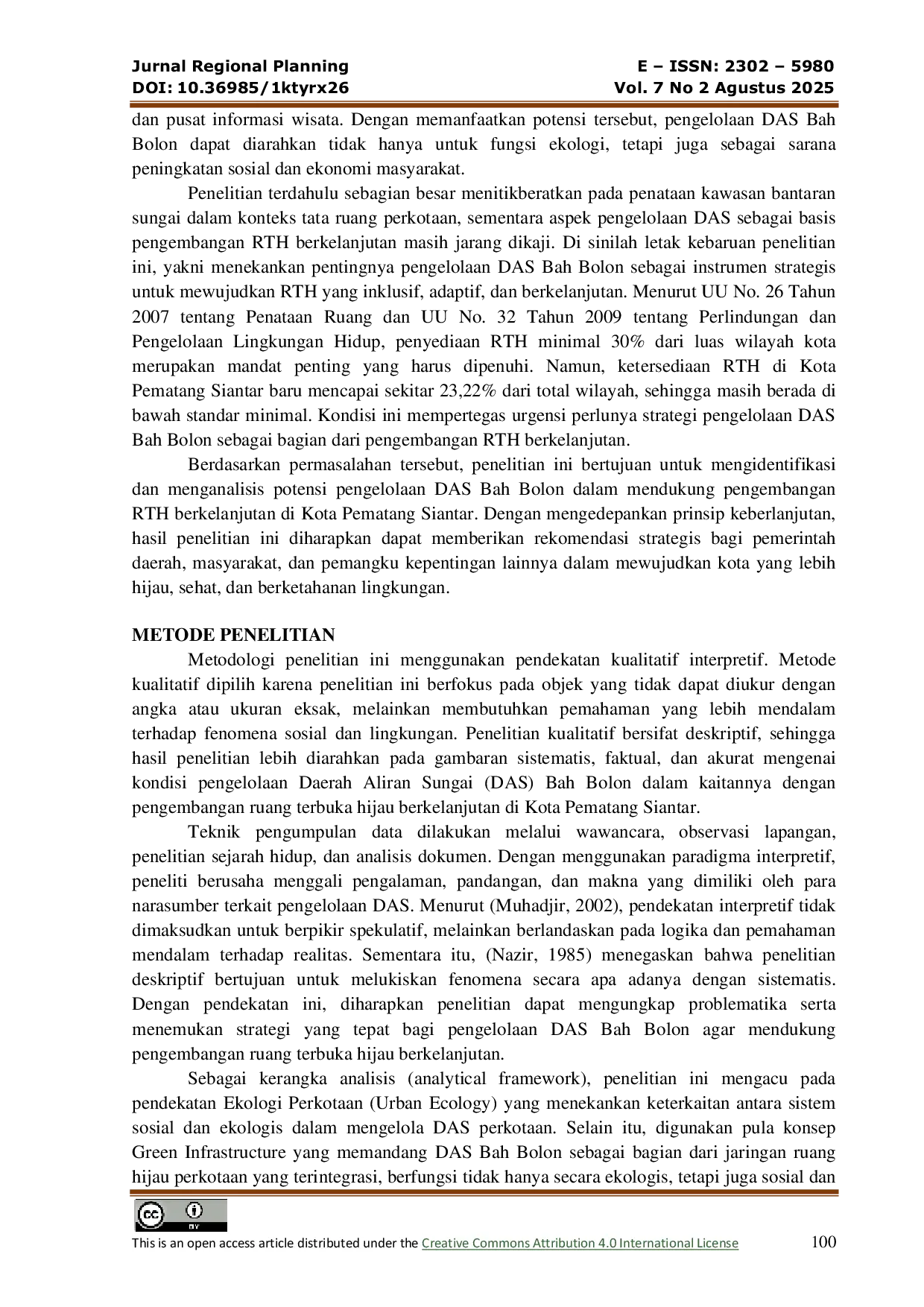 Jurnal Regional PlanningJurnal Regional PlanningPengelolaan Daerah Aliran Sungai (DAS) Bah Bolon memiliki peran penting dalam mendukung ketersediaan Ruang Terbuka Hijau (RTH) berkelanjutan di Kota Pematang Siantar. Penelitian ini bertujuan untuk menganalisis kondisi pengelolaan DAS Bah Bolon, mengidentifikasi permasalahan utama, serta merumuskan strategi pengembangan RTH berbasis keberlanjutan. Metode penelitian yang digunakan adalah pendekatan kualitatif dengan teknik observasi, wawancara, dan studi dokumen, serta didukung analisis deskriptif. Hasil penelitian menunjukkan bahwa pengelolaan DAS Bah Bolon menghadapi beberapa persoalan, antara lain lemahnya implementasi kebijakan tata ruang, rendahnya kesadaran masyarakat, keterbatasan anggaran pemerintah, serta maraknya alih fungsi lahan di sempadan sungai. Meskipun demikian, terdapat peluang strategis berupa lahan kosong di sempadan sungai yang dapat direhabilitasi menjadi koridor hijau perkotaan. Strategi pengembangan yang diusulkan meliputi: rehabilitasi vegetasi bantaran sungai dengan tanaman lokal, penguatan regulasi dan penegakan hukum, pemberdayaan masyarakat melalui program lingkungan, kolaborasi multipihak, serta pembangunan infrastruktur adaptif terhadap perubahan iklim. Temuan ini sejalan mendukung pencapaian SDG 11 tentang Sustainable Cities and Communities. Implikasi penelitian menunjukkan bahwa pengelolaan DAS Bah Bolon dapat menjadi fondasi pengembangan RTH berkelanjutan yang tidak hanya meningkatkan kualitas ekologis, tetapi juga memperbaiki estetika kota, memperkuat ketahanan sosial, dan membuka peluang ekonomi berbasis ekowisata.