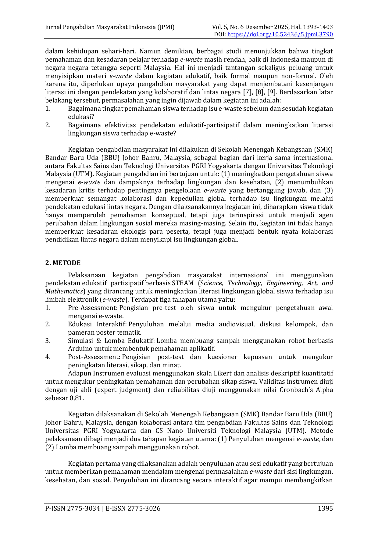 Jurnal Pengabdian Masyarakat IndonesiaJurnal Pengabdian Masyarakat IndonesiaPermasalahan limbah elektronik (e-waste) menjadi isu lingkungan global yang mendesak, khususnya di negara-negara berkembang. Kegiatan pengabdian internasional ini bertujuan untuk meningkatkan literasi lingkungan hidup siswa SMK Bandar Baru UDA (BBU), Johor Bahru, Malaysia, melalui edukasi e-waste yang dikemas dalam bentuk penyuluhan interaktif dan kegiatan partisipatif. Kegiatan diikuti oleh 142 peserta, yang terdiri dari 124 siswa, 7 guru pendamping, serta tim dari Universitas PGRI Yogyakarta dan CSNano Universitas Teknologi Malaysia. Materi disampaikan melalui metode audio-visual, pameran poster, dan kuis interaktif yang dirancang untuk meningkatkan pemahaman serta sikap terhadap pengelolaan e-waste. Hasil evaluasi menunjukkan adanya peningkatan signifikan dalam literasi lingkungan: pemahaman terhadap bahaya e-waste dan pentingnya daur ulang meningkat dari 63,71% menjadi 72,58%, sikap bertanggung jawab dalam pengelolaan e-waste naik dari 56,45% menjadi 64,41%, dan minat mengikuti kampanye e-waste meningkat dari 45,97% menjadi 54,23%. Dukungan terhadap pentingnya edukasi e-waste di sekolah juga mengalami peningkatan dari 71% menjadi 74,58%. Temuan ini mengindikasikan bahwa pendekatan edukatif berbasis kolaborasi internasional efektif dalam meningkatkan kesadaran dan partisipasi aktif generasi muda terhadap isu lingkungan hidup.