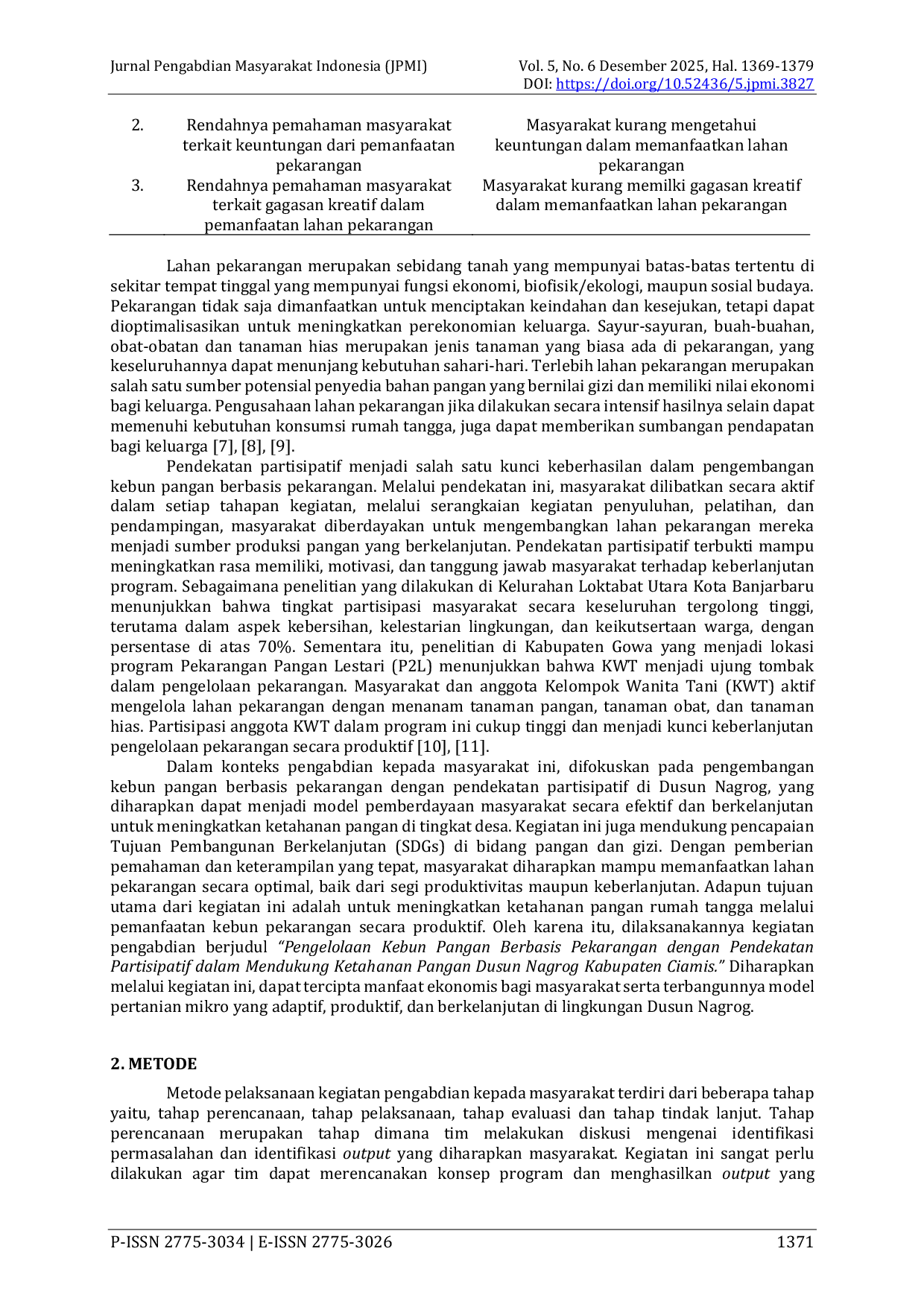 Jurnal Pengabdian Masyarakat IndonesiaJurnal Pengabdian Masyarakat IndonesiaMasyarakat Dusun Nagrog, khususnya Kelompok Wanita Tani (KWT) Mawar, belum sepenuhnya memanfaatkan pekarangan rumah secara produktif, padahal wilayah tersebut memiliki potensi pertanian yang tinggi. Program kebun pangan berbasis pekarangan dianggap penting untuk meningkatkan kesadaran KWT Mawar dan masyarakat dalam mendukung ketahanan pangan Dusun Nagrog skala rumah tangga. Metode pengabdian kepada masyarakat ini dilaksanakan melalui empat tahap: perencanaan, pelaksanaan (pembersihan lahan, penyemaian, penanaman, pemetaan, sosialisasi, pemberian bibit), evaluasi (jumlah bibit tumbuh, tingkat pemahaman), dan tindak lanjut (monitoring). Hasilnya menunjukkan peningkatan kesadaran KWT Mawar dan masyarakat terhadap ketahanan pangan rumah tangga, yang terlihat dari perubahan fungsional pekarangan menjadi lebih produktif. Program ini memungkinkan KWT Mawar dan sebagian masyarakat mengelola kebun pangan rumah tangga secara mandiri.
