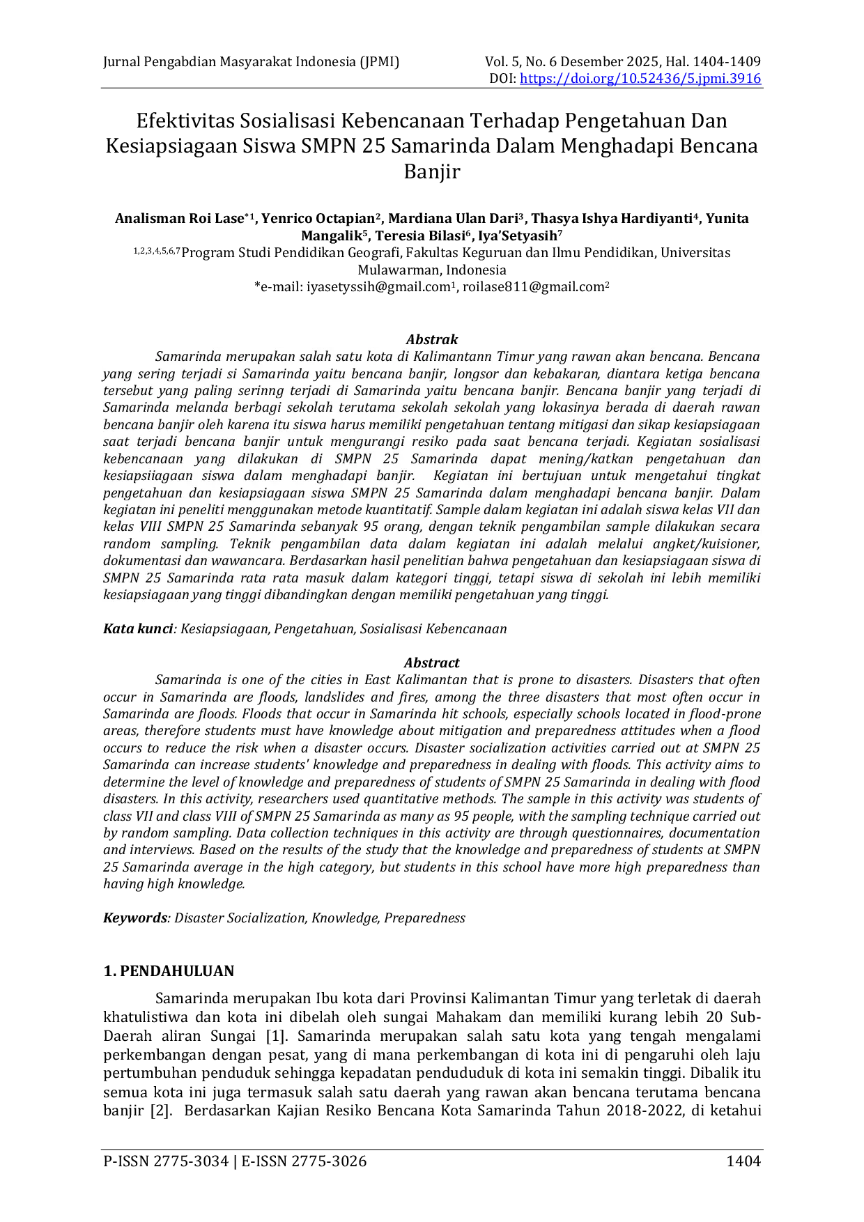 Jurnal Pengabdian Masyarakat IndonesiaJurnal Pengabdian Masyarakat IndonesiaSamarinda merupakan salah satu kota di Kalimantan Timur yang rawan akan bencana. Bencana yang sering terjadi di Samarinda yaitu bencana banjir, longsor dan kebakaran, diantara ketiga bencana tersebut yang paling sering terjadi di Samarinda yaitu bencana banjir. Bencana banjir yang terjadi di Samarinda melanda berbagai sekolah terutama sekolah-sekolah yang lokasinya berada di daerah rawan bencana banjir oleh karena itu siswa harus memiliki pengetahuan tentang mitigasi dan sikap kesiapsiagaan saat terjadi bencana banjir untuk mengurangi resiko pada saat bencana terjadi. Kegiatan sosialisasi kebencanaan yang dilakukan di SMPN 25 Samarinda dapat meningkatkan pengetahuan dan kesiapsiagaan siswa dalam menghadapi banjir. Kegiatan ini bertujuan untuk mengetahui tingkat pengetahuan dan kesiapsiagaan siswa SMPN 25 Samarinda dalam menghadapi bencana banjir. Dalam kegiatan ini peneliti menggunakan metode kuantitatif. Sample dalam kegiatan ini adalah siswa kelas VII dan kelas VIII SMPN 25 Samarinda sebanyak 95 orang, dengan teknik pengambilan sample dilakukan secara random sampling. Teknik pengambilan data dalam kegiatan ini adalah melalui angket/kuisioner, dokumentasi dan wawancara. Berdasarkan hasil penelitian bahwa pengetahuan dan kesiapsiagaan siswa di SMPN 25 Samarinda rata-rata masuk dalam kategori tinggi, tetapi siswa di sekolah ini lebih memiliki kesiapsiagaan yang tinggi dibandingkan dengan memiliki pengetahuan yang tinggi.