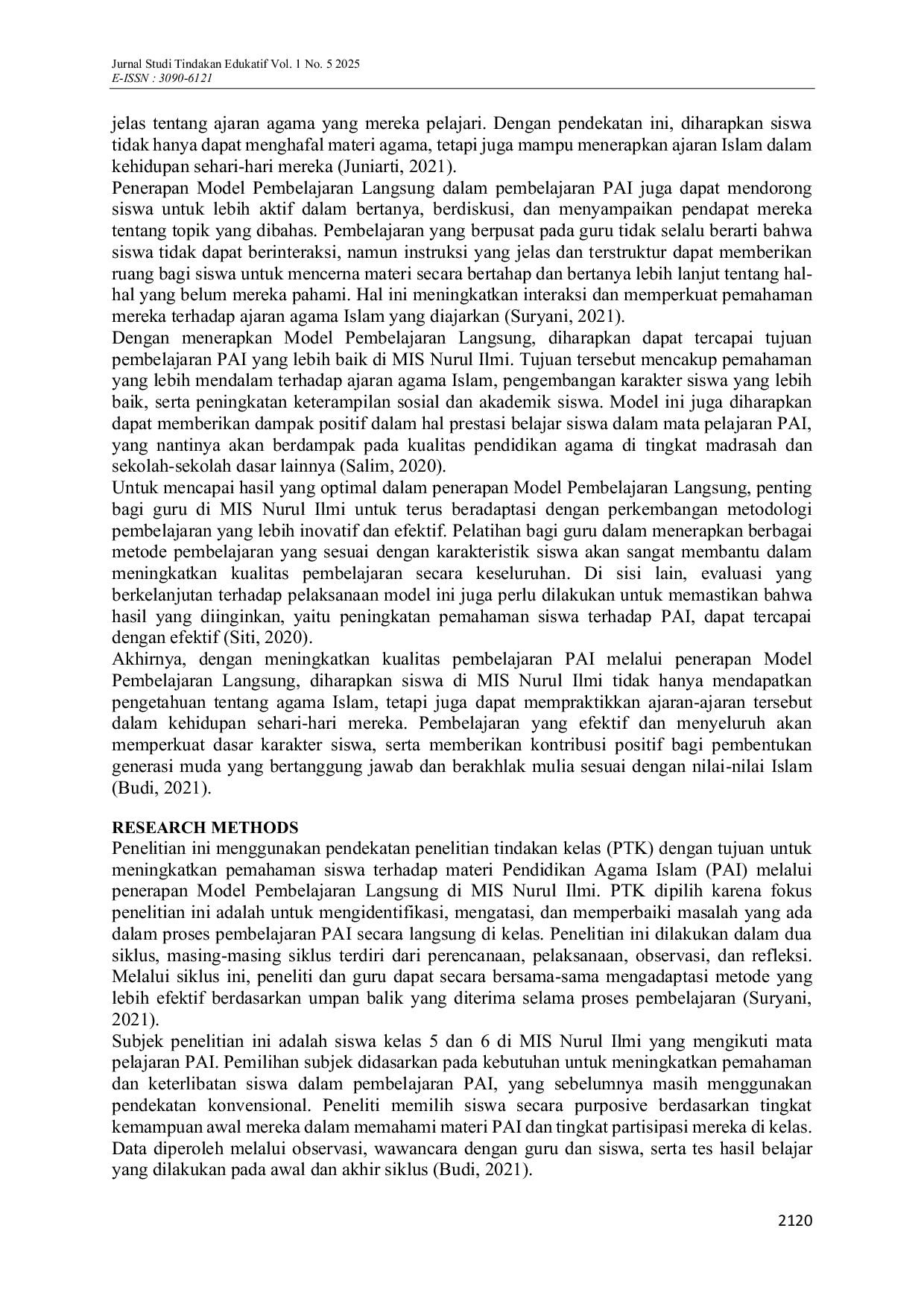 JURNAL Studi Tindakan Edukatif ( JSTE )JURNAL Studi Tindakan Edukatif ( JSTE )Penelitian ini bertujuan untuk meningkatkan hasil belajar siswa dalam Pendidikan Agama Islam (PAI) di MIS Nurul Ilmi dengan menerapkan Model Pembelajaran Langsung. PAI, sebagai mata pelajaran penting di sekolah Islam, berfokus pada penanaman nilai-nilai agama, pengetahuan, dan praktik. Namun, metode pengajaran tradisional seringkali menyebabkan keterbatasan pemahaman dan partisipasi siswa. Model Pembelajaran Langsung, yang dikenal dengan pendekatan terstruktur dan dipimpin guru, dipilih untuk mengatasi tantangan ini. Penelitian ini menggunakan pendekatan penelitian tindakan kelas (PTK), dilakukan dalam dua siklus, melibatkan siswa kelas 5 dan 6 di MIS Nurul Ilmi. Data dikumpulkan melalui observasi, penilaian siswa, dan umpan balik dari guru dan siswa. Hasil penelitian menunjukkan bahwa Model Pembelajaran Langsung meningkatkan partisipasi, pemahaman, dan prestasi akademik siswa dalam PAI. Siswa menunjukkan pemahaman yang lebih dalam tentang ajaran Islam, terutama dalam praktik ibadah dan nilai-nilai moral. Umpan balik guru juga menunjukkan bahwa model ini memberikan panduan yang jelas dan meningkatkan efisiensi pengajaran. Penelitian ini menyimpulkan bahwa Model Pembelajaran Langsung adalah strategi pengajaran yang efektif untuk meningkatkan hasil belajar PAI di MIS Nurul Ilmi, menciptakan lingkungan belajar yang lebih terstruktur dan berdampak.