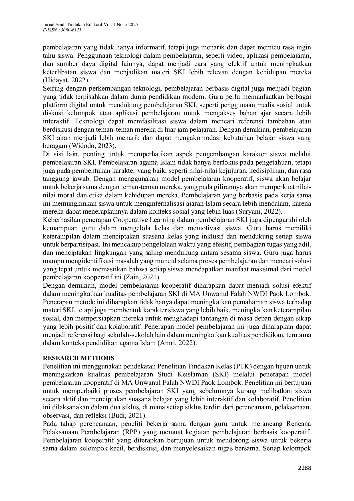 Berdasarkan hasil penelitian di MA Unwanul Falah NWDI Paok Lombok, dapat disimpulkan bahwa penerapan Model Pembelajaran Kooperatif dalam Studi Keislaman (SKI) berhasil meningkatkan keterlibatan siswa, pemahaman materi, dan motivasi belajar secara signifikan.Pembelajaran berbasis kooperatif ini menciptakan suasana belajar yang interaktif, kolaboratif, dan menyenangkan.Melalui diskusi kelompok dan tugas bersama, siswa dapat berbagi pengetahuan, berpikir kritis, dan memperdalam pemahaman mereka terhadap materi SKI.Meskipun ada tantangan, seperti ketidakseimbangan partisipasi antara siswa yang lebih dominan dan yang lebih pasif, model kooperatif menunjukkan perubahan positif dalam interaksi antar siswa.Model ini membantu menciptakan lingkungan belajar yang inklusif, di mana setiap siswa memiliki kesempatan yang sama untuk berkontribusi.Tantangan terbesar adalah perbedaan kemampuan dan kesiapan siswa dalam berpartisipasi aktif dalam kelompok.Pembagian kelompok yang merata dan sesuai dengan kemampuan siswa sangat penting untuk memastikan keterlibatan maksimal.Model kooperatif terbukti meningkatkan motivasi belajar siswa dan keterampilan sosial mereka, seperti kemampuan berkomunikasi, bekerja sama, dan menghargai pendapat orang lain.Meskipun ada tantangan dalam mengelola kelas dan waktu, penerapan model ini terbukti efektif dalam meningkatkan kualitas pembelajaran.Model pembelajaran kooperatif memberikan pengalaman belajar yang bermakna, di mana siswa merasa lebih terlibat, dihargai, dan termotivasi untuk belajar.Keberhasilan ini menunjukkan bahwa pembelajaran berbasis kolaborasi dapat menjadi metode yang sangat efektif dalam meningkatkan pembelajaran agama Islam di sekolah menengah.