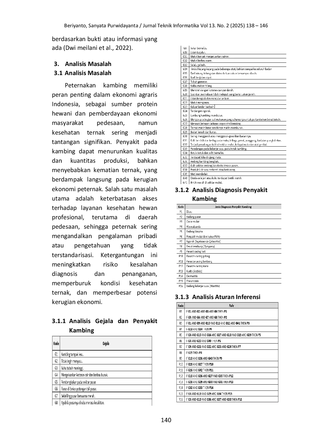 Bagaimana peningkatan akurasi sistem pakar diagnosa penyakit kambing jika basis pengetahuan diperluas mencakup lebih banyak jenis penyakit dan gejala secara komprehensif? Apakah pengembangan aplikasi seluler berbasis web dapat meningkatkan aksesibilitas dan efisiensi penggunaan sistem pakar oleh peternak di daerah terpencil, serta bagaimana persepsi pengguna terhadap antarmuka tersebut? Bagaimana performa metode Certainty Factor dibandingkan dengan teknik penanganan ketidakpastian lainnya, seperti logika fuzzy atau jaringan Bayesian, dalam konteks diagnosa penyakit kambing? Penelitian-penelitian tersebut dapat memberikan wawasan mendalam tentang skalabilitas, kegunaan, dan keunggulan metodologis sistem, sehingga memperkuat kontribusi praktis dan teoritis dalam bidang kesehatan ternak.