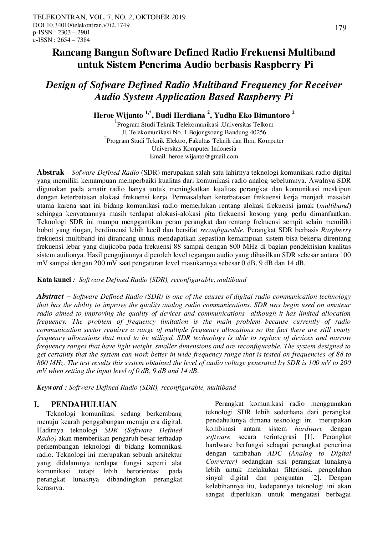 Telekontran : Jurnal Ilmiah Telekomunikasi, Kendali dan Elektronika TerapanTelekontran : Jurnal Ilmiah Telekomunikasi, Kendali dan Elektronika TerapanAbstrak – Sofware Defined Radio (SDR) merupakan salah satu lahirnya teknologi komunikasi radio digital yang memiliki kemampuan memperbaiki kualitas dari komunikasi radio analog sebelumnya. Awalnya SDR digunakan pada amatir radio hanya untuk meningkatkan kualitas perangkat dan komunikasi meskipun dengan keterbatasan alokasi frekuensi kerja. Permasalahan keterbatasan frekuensi kerja menjadi masalah utama karena saat ini bidang komunikasi radio memerlukan rentang alokasi frekuensi jamak (multiband) sehingga kenyataannya masih terdapat alokasi-alokasi pita frekuensi kosong yang perlu dimanfaatkan. Teknologi SDR ini mampu menggantikan peran perangkat dan rentang frekuensi sempit selain memiliki bobot yang ringan, berdimensi lebih kecil dan bersifat reconfigurable. Perangkat SDR berbasis Raspberry frekuensi multiband ini dirancang untuk mendapatkan kepastian kemampuan sistem bisa bekerja direntang frekuensi lebar yang diujicoba pada frekuensi 88 sampai dengan 800 MHz di bagian pendektisian kualitas sistem audionya. Hasil pengujiannya diperoleh level tegangan audio yang dihasilkan SDR sebesar antara 100 mV sampai dengan 200 mV saat pengaturan level masukannya sebesar 0 dB, 9 dB dan 14 dB.