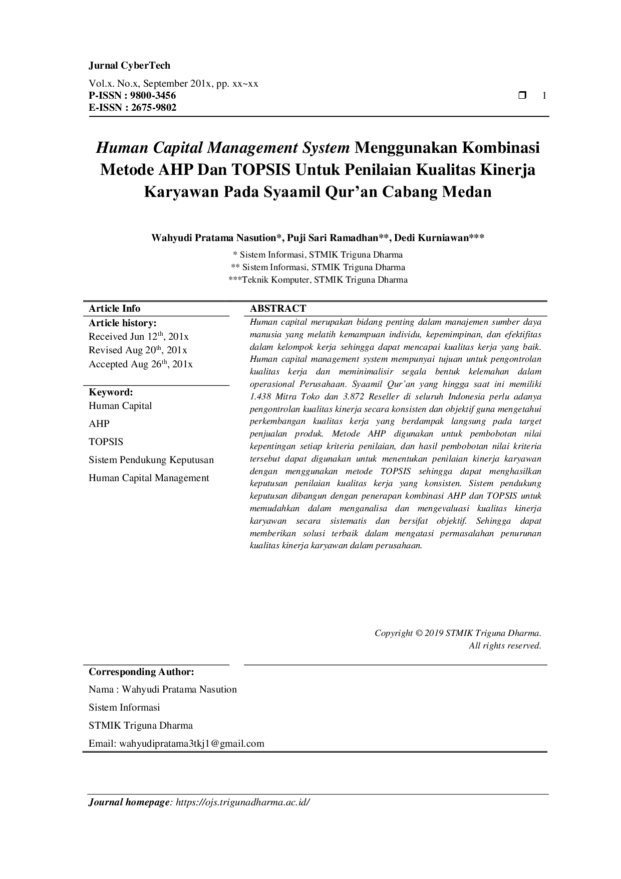 Jurnal Cyber TechJurnal Cyber TechHuman capital merupakan bidang penting dalam manajemen sumber daya manusia yang melatih kemampuan individu, kepemimpinan, dan efektifitas dalam kelompok kerja sehingga dapat mencapai kualitas kerja yang baik. Human capital management system mempunyai tujuan untuk pengontrolan kualitas kerja dan meminimalisir segala bentuk kelemahan dalam operasional Perusahaan. Syaamil Quran yang hingga saat ini memiliki 1.438 Mitra Toko dan 3.872 Reseller di seluruh Indonesia perlu adanya pengontrolan kualitas kinerja secara konsisten dan objektif guna mengetahui perkembangan kualitas kerja yang berdampak langsung pada target penjualan produk. Metode AHP digunakan untuk pembobotan nilai kepentingan setiap kriteria penilaian, dan hasil pembobotan nilai kriteria tersebut dapat digunakan untuk menentukan penilaian kinerja karyawan dengan menggunakan metode TOPSIS sehingga dapat menghasilkan keputusan penilaian kualitas kerja yang konsisten. Sistem pendukung keputusan dibangun dengan penerapan kombinasi AHP dan TOPSIS untuk memudahkan dalam menganalisa dan mengevaluasi kualitas kinerja karyawan secara sistematis dan bersifat objektif. Sehingga dapat memberikan solusi terbaik dalam mengatasi permasalahan penurunan kualitas kinerja karyawan dalam perusahaan.