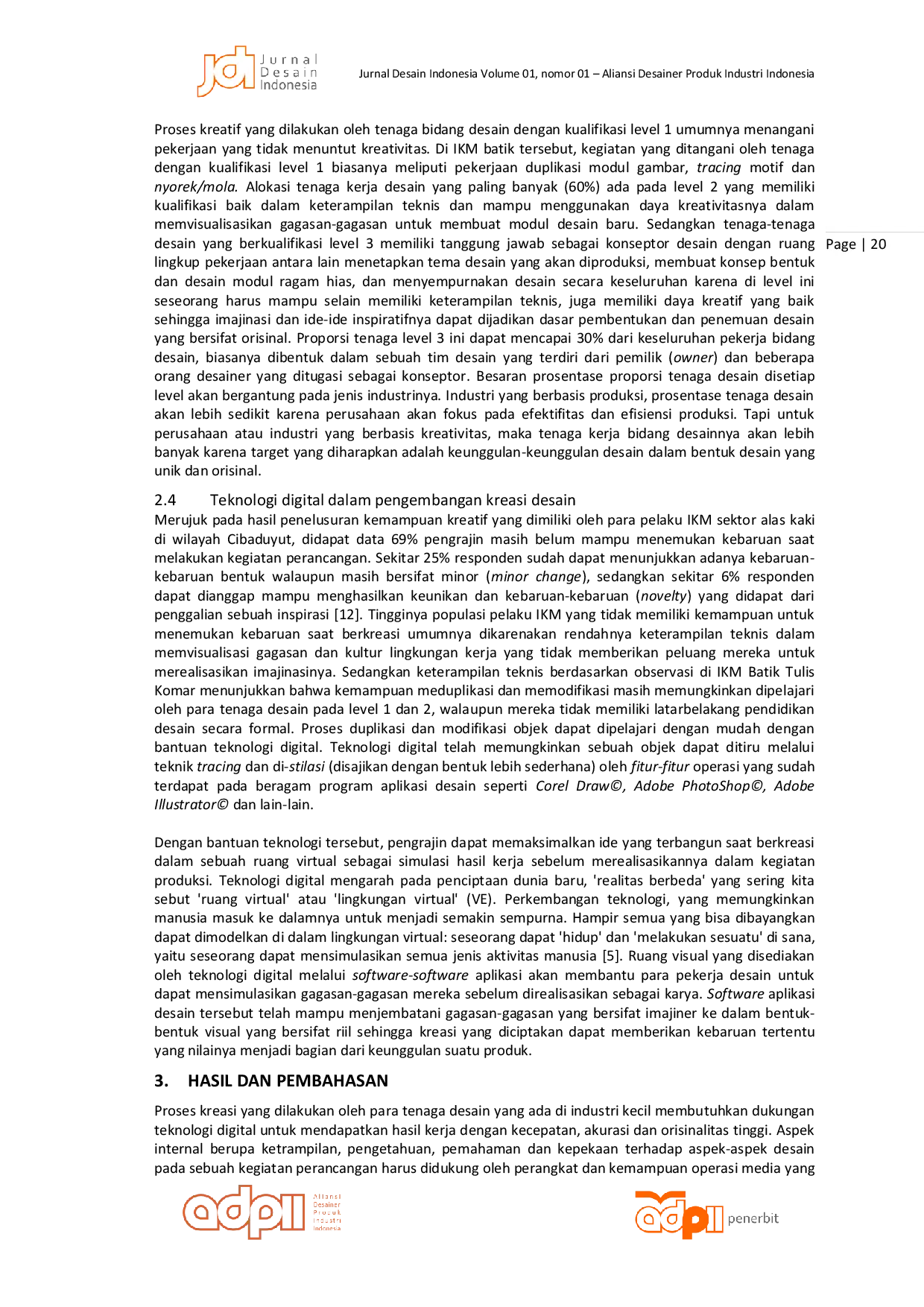 Jurnal Desain Indonesia.Jurnal Desain Indonesia.Pemanfaatan teknologi digital dan informatika di dunia industri memiliki peran penting pada bidang perancangan, produksi, distribusi hingga pemasaran sehingga mampu menggantikan cara-cara konvensional yang selama ini diterapkan. Perkembangan teknologi digital di dunia industri membuat Indonesia berusaha untuk menjadi negara industri maju melalui pencanangan Revolusi Industri Indonesia 4.0 sebagai konsep pembangunan industrinya. Namun percepatan penggunaan teknologi digital tersebut belum sepenuhnya mampu diikuti oleh kelas industri kecil-menengah (IKM), yang salah satu penyebabnya adalah sumber daya manusia (SDM) di industri yang masih gagap terhadap adanya kemajuan tersebut. Di industri kecil alas kaki, teknologi digital dapat diterapkan pada kegiatan perancangan produk atau pembuatan ornamen ragam hias pada upper. Hanya saja untuk dapat diimplementasikan sebagai proses kreasi, diperlukan strategi khusus mengingat SDM yang berperan sebagai tenaga kerja bidang desain di IKM-IKM umumnya tidak memiliki pendidikan formal dan pada umumnya terbiasa dengan tindakan peniruan atau memodifikasi yang mengakibatkan rendahnya kemampuan kreativitas mereka. Merujuk pada kondisi seperti itu, maka dikembangkan teknik modifikasi digital (Digital Modification Technique/ DMT) yang merupakan teknik menyederhanakan bentuk dari suatu objek tertentu (stilasi) dengan melibatkan software aplikasi desain untuk menghasilkan kreasi-kreasi baru dalam bentuk ragam hias, yang kemudian dijadikan ornamen visual pada bagian upper sepatu. Melalui teknik sederhana ini diharapkan para pengrajin dapat mempelajarinya dengan mudah sehingga lebih produktif dan kreatif untuk menghasilkan kebaruan dan keunikan pada produk-produk yang mereka hasilkan.