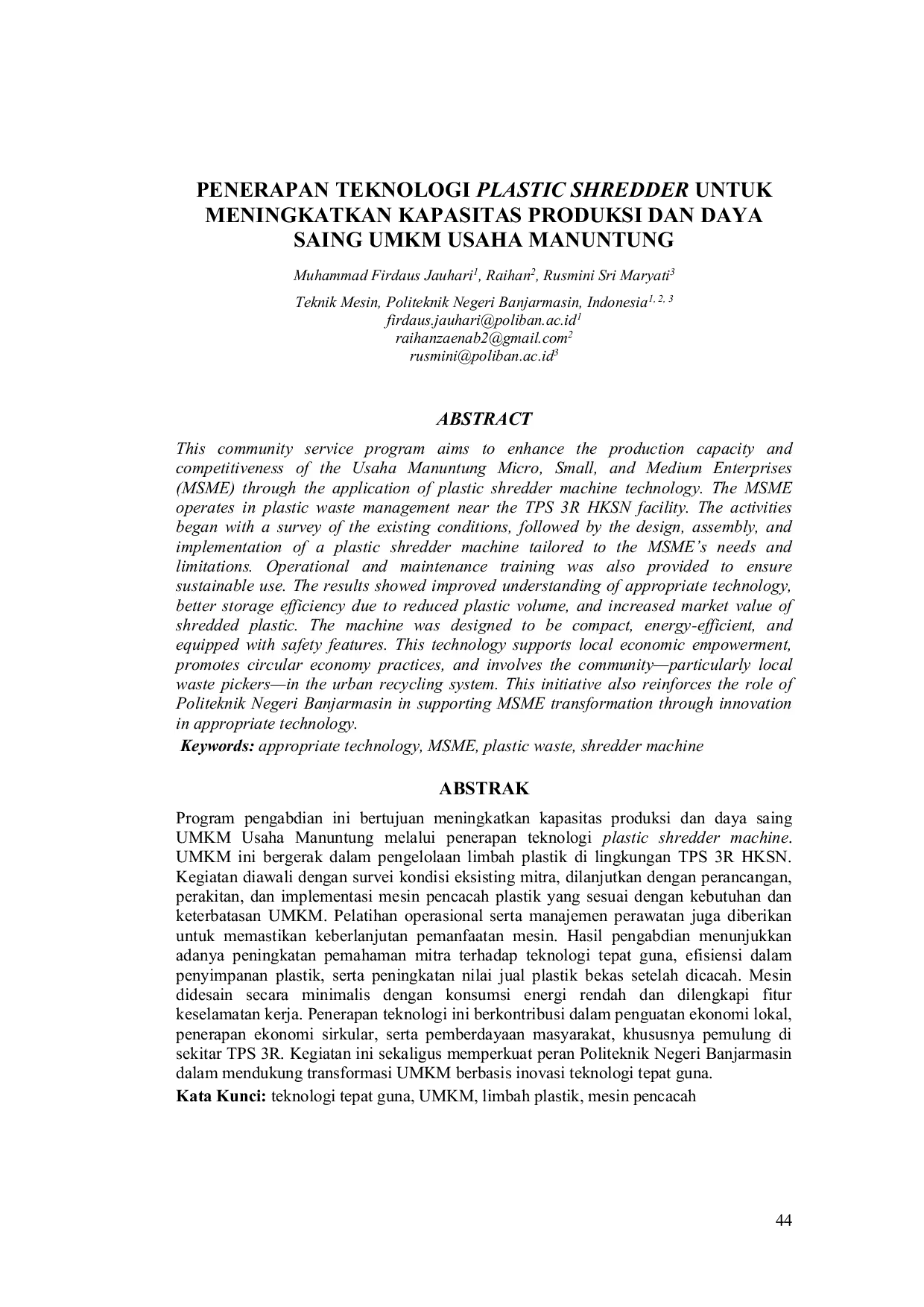 Jurnal IMPACT: Implementation and ActionJurnal IMPACT: Implementation and ActionProgram pengabdian ini bertujuan meningkatkan kapasitas produksi dan daya saing UMKM Usaha Manuntung melalui penerapan teknologi plastic shredder machine. UMKM ini bergerak dalam pengelolaan limbah plastik di lingkungan TPS 3R HKSN. Kegiatan diawali dengan survei kondisi eksisting mitra, dilanjutkan dengan perancangan, perakitan, dan implementasi mesin pencacah plastik yang sesuai dengan kebutuhan dan keterbatasan UMKM. Pelatihan operasional serta manajemen perawatan juga diberikan untuk memastikan keberlanjutan pemanfaatan mesin. Hasil pengabdian menunjukkan adanya peningkatan pemahaman mitra terhadap teknologi tepat guna, efisiensi dalam penyimpanan plastik, serta peningkatan nilai jual plastik bekas setelah dicacah. Mesin didesain secara minimalis dengan konsumsi energi rendah dan dilengkapi fitur keselamatan kerja. Penerapan teknologi ini berkontribusi dalam penguatan ekonomi lokal, penerapan ekonomi sirkular, serta pemberdayaan masyarakat, khususnya pemulung di sekitar TPS 3R. Kegiatan ini sekaligus memperkuat peran Politeknik Negeri Banjarmasin dalam mendukung transformasi UMKM berbasis inovasi teknologi tepat guna.