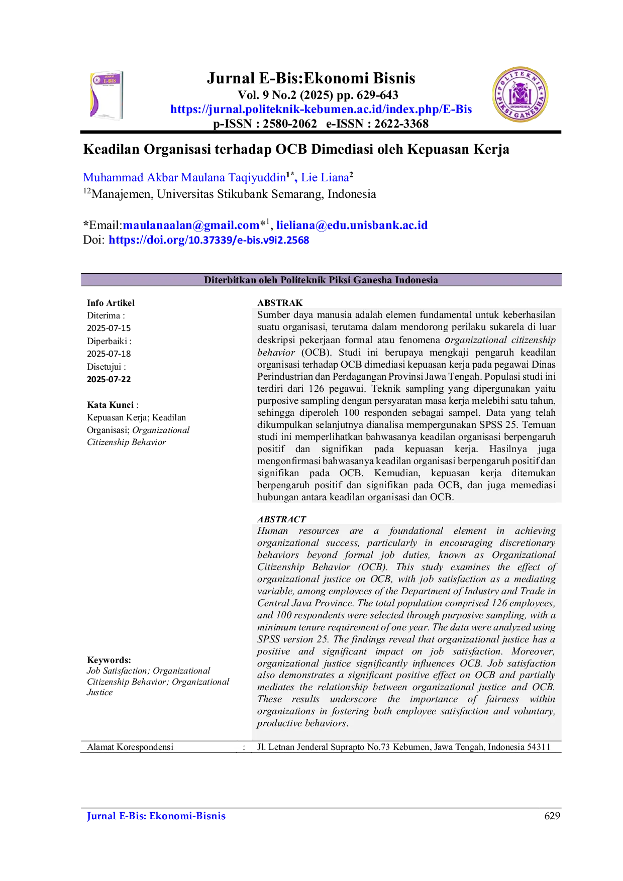 Jurnal E-BisJurnal E-BisSumber daya manusia adalah elemen fundamental untuk keberhasilan suatu organisasi, terutama dalam mendorong perilaku sukarela di luar deskripsi pekerjaan formal atau fenomena organizational citizenship behavior (OCB). Studi ini berupaya mengkaji pengaruh keadilan organisasi terhadap OCB dimediasi kepuasan kerja pada pegawai Dinas Perindustrian dan Perdagangan Provinsi Jawa Tengah. Populasi studi ini terdiri dari 126 pegawai. Teknik sampling yang dipergunakan yaitu purposive sampling dengan persyaratan masa kerja melebihi satu tahun, sehingga diperoleh 100 responden sebagai sampel. Data yang telah dikumpulkan selanjutnya dianalisa mempergunakan SPSS 25. Temuan studi ini memperlihatkan bahwasanya keadilan organisasi berpengaruh juga positif dan mengonfirmasi bahwasanya keadilan organisasi berpengaruh positif dan signifikan pada OCB. Kemudian, kepuasan kerja ditemukan berpengaruh positif dan signifikan pada OCB, dan juga memediasi hubungan antara keadilan organisasi dan OCB.