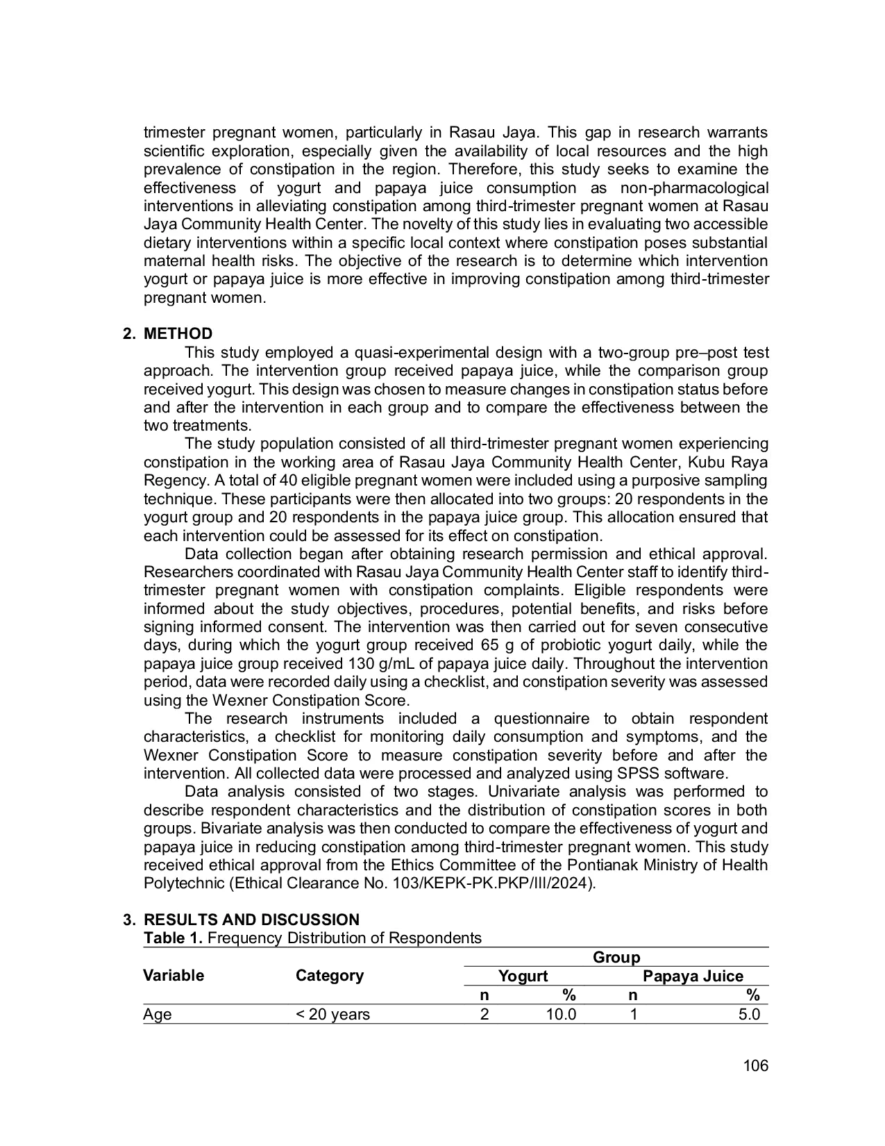 Yogurt and papaya juice are effective in managing constipation in third trimester pregnant women at the Rasau Jaya Health Center in Kubu Raya District.Yogurt demonstrated higher efficacy than papaya juice in alleviating constipation complaints.This suggests that yogurt, with its probiotic and prebiotic components, may be a more effective intervention for improving bowel function during pregnancy.