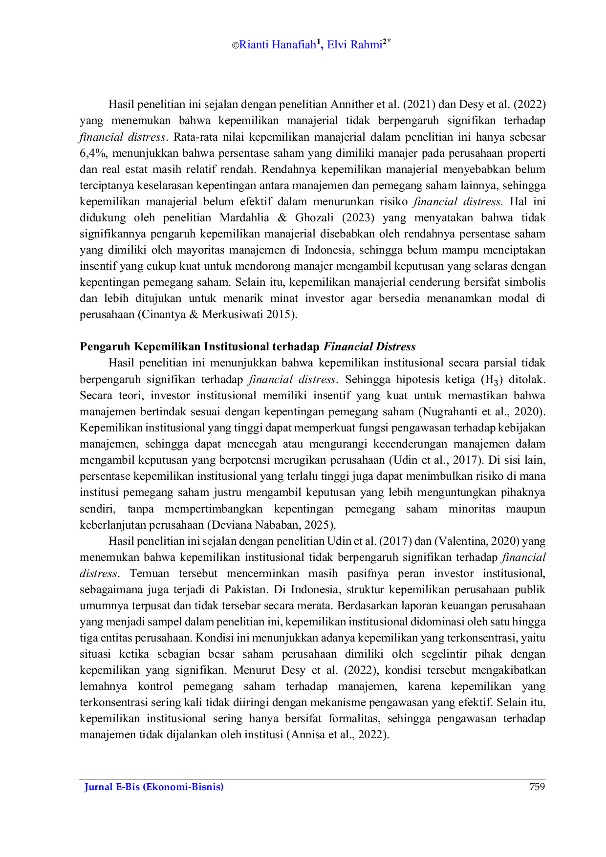 Jurnal E-BisJurnal E-BisRiset ini bertujuan untuk mengetahui pengaruh kepemilikan manajerial, kepemilikan institusional, dan proporsi dewan komisaris independen terhadap financial distress pada perusahaan properti dan real estat yang terdaftar di BEI. Riset ini menggunakan pendekatan kuantitatif asosiatif dengan analisis regresi data panel (REM) dan alat bantu e-views 12. Data panel terdiri atas cross section (50 perusahaan) serta time series (2020-2024) berupa data sekunder, bersumber dari annual report perusahaan. Peneliti menggunakan studi dokumentasi sebagai metode untuk mengumpulkan data. Hasil riset mengindikasikan bahwa secara parsial kepemilikan manajerial, kepemilikan institusional, dan proporsi dewan komisaris independen tidak berpengaruh signifikan terhadap financial distress pada perusahaan properti dan real estat. Secara simultan, ketiga variabel tesebut juga tidak berpengaruh signifikan terhadap financial distress pada perusahaan properti dan real estat.
