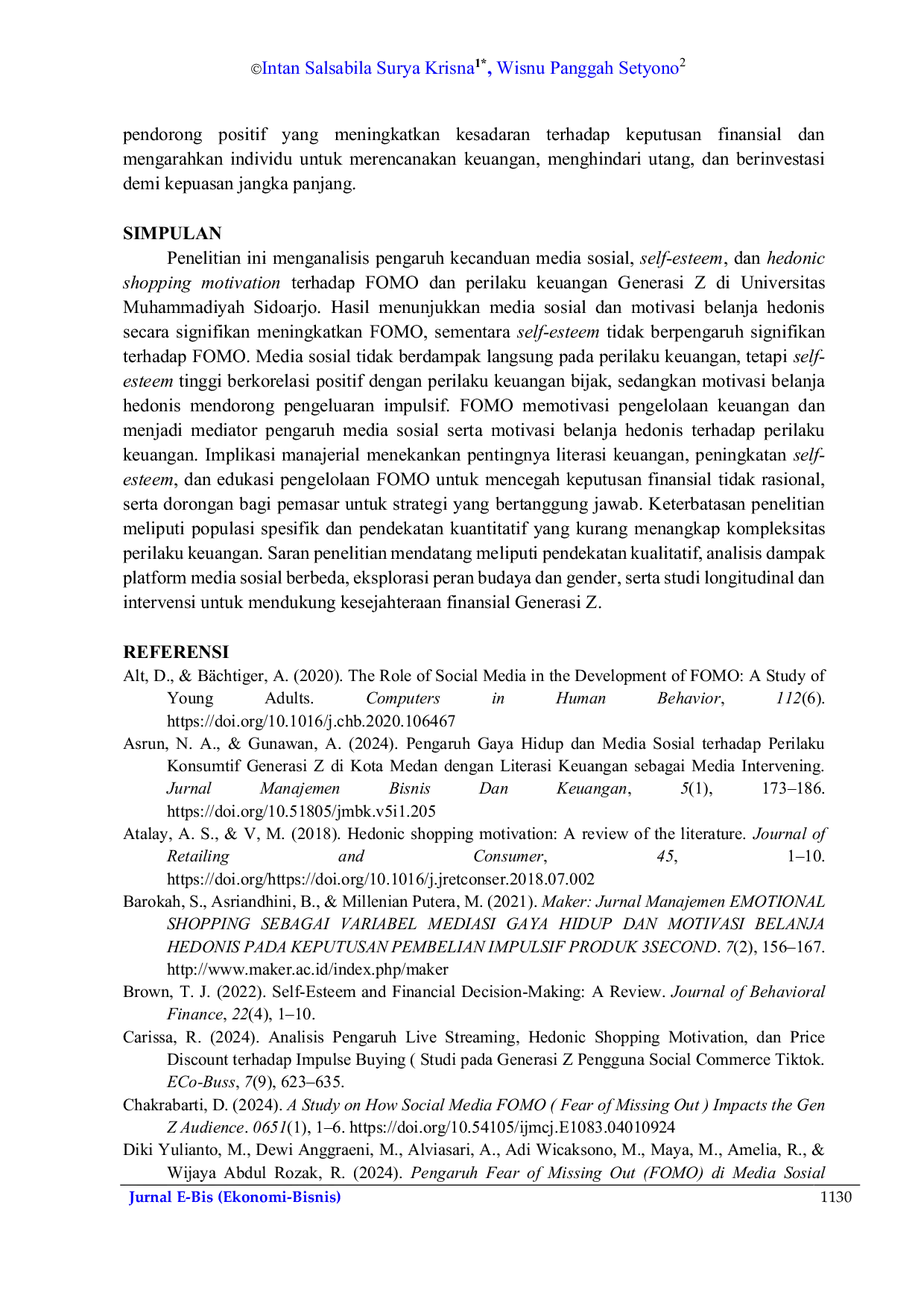 Jurnal E-BisJurnal E-BisPenelitian ini dilatarbelakangi oleh tingginya pengaruh media sosial terhadap perilaku keuangan Generasi Z, khususnya terkait fenomena Fear of Missing Out (FOMO) dan motivasi belanja hedonis. Tujuan penelitian adalah untuk menganalisis pengaruh kecanduan media sosial, self-esteem, dan Hedonic Shopping Motivation terhadap FOMO, serta dampak FOMO terhadap perilaku keuangan Generasi Z. Metode yang digunakan adalah survei kuantitatif dengan sampel 385 mahasiswa Generasi Z di Universitas Muhammadiyah Sidoarjo, yang dipilih secara purposive. Data dianalisis menggunakan Partial Least Squares Structural Equation Modeling (PLS-SEM). Hasil penelitian menunjukkan bahwa kecanduan media sosial dan Hedonic Shopping Motivation berpengaruh positif signifikan terhadap FOMO, sementara self-esteem tidak berpengaruh signifikan. FOMO sendiri memiliki pengaruh positif terhadap perilaku keuangan, sedangkan self-esteem berkontribusi positif pada perilaku keuangan yang bijak. Temuan ini memberikan wawasan penting untuk pengembangan literasi keuangan dan kesejahteraan mental Generasi Z.