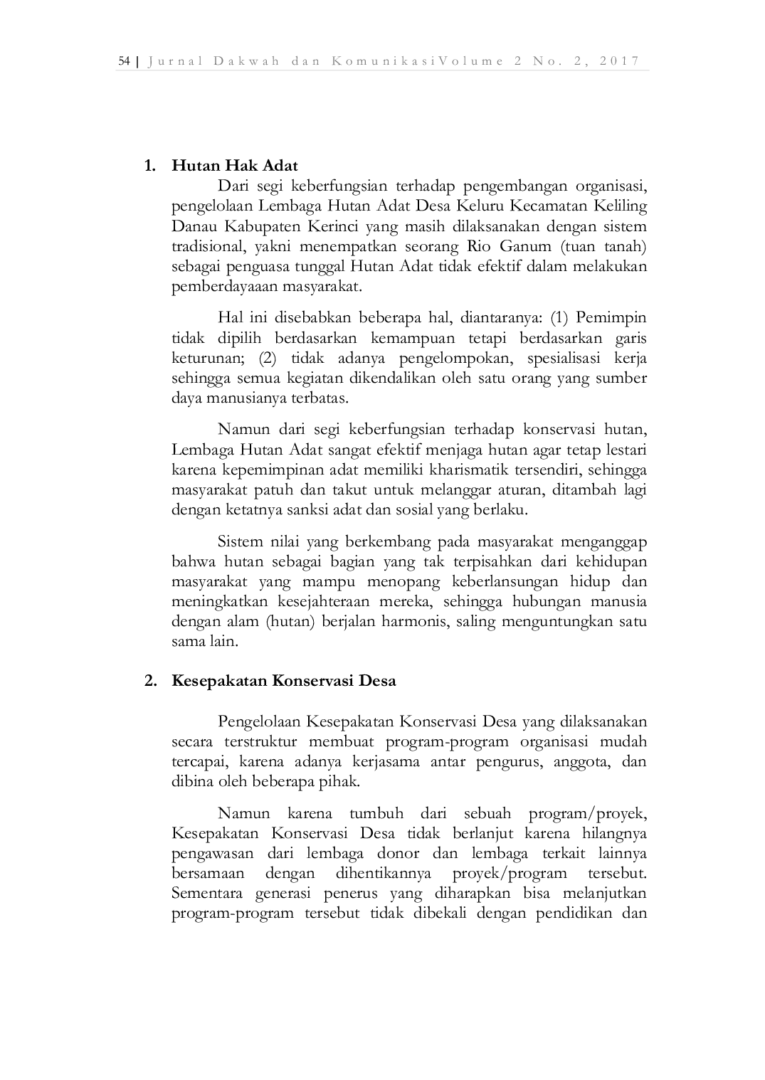 Jurnal Dakwah dan KomunikasiJurnal Dakwah dan KomunikasiDakwah sebagai pilar Islam dalam menyampaikan wahyu Allah harus diartikan secara luas, materi dakwah tidak hanya terkait hal-hal pokok (tauhid) tetapi juga menyangkut kelestarian alam dan kesejahteraan umat (masyarakat). Hutan harus dikelola secara bersama-sama antara masyarakat dan pemerintah sehingga terjaga kelestariannya, sementara masyarakat yang tinggal di sekitarnya tersejahterakan. Penelitian ini bercorak field research dengan jenis penelitian kualitatif, Metode penelitian yang digunakan adalah action research atau kaji tindak dengan pendekatan participatory, pendekatan ini menekankan pentingnya proses dialog dalam penelitian. Dalam hal ini dapat dilihat bagaimana konsep dakwah dalam pemeliharaan dan pemberdayaan masyarakat di sekitar hutan di kabupaten kerinci.