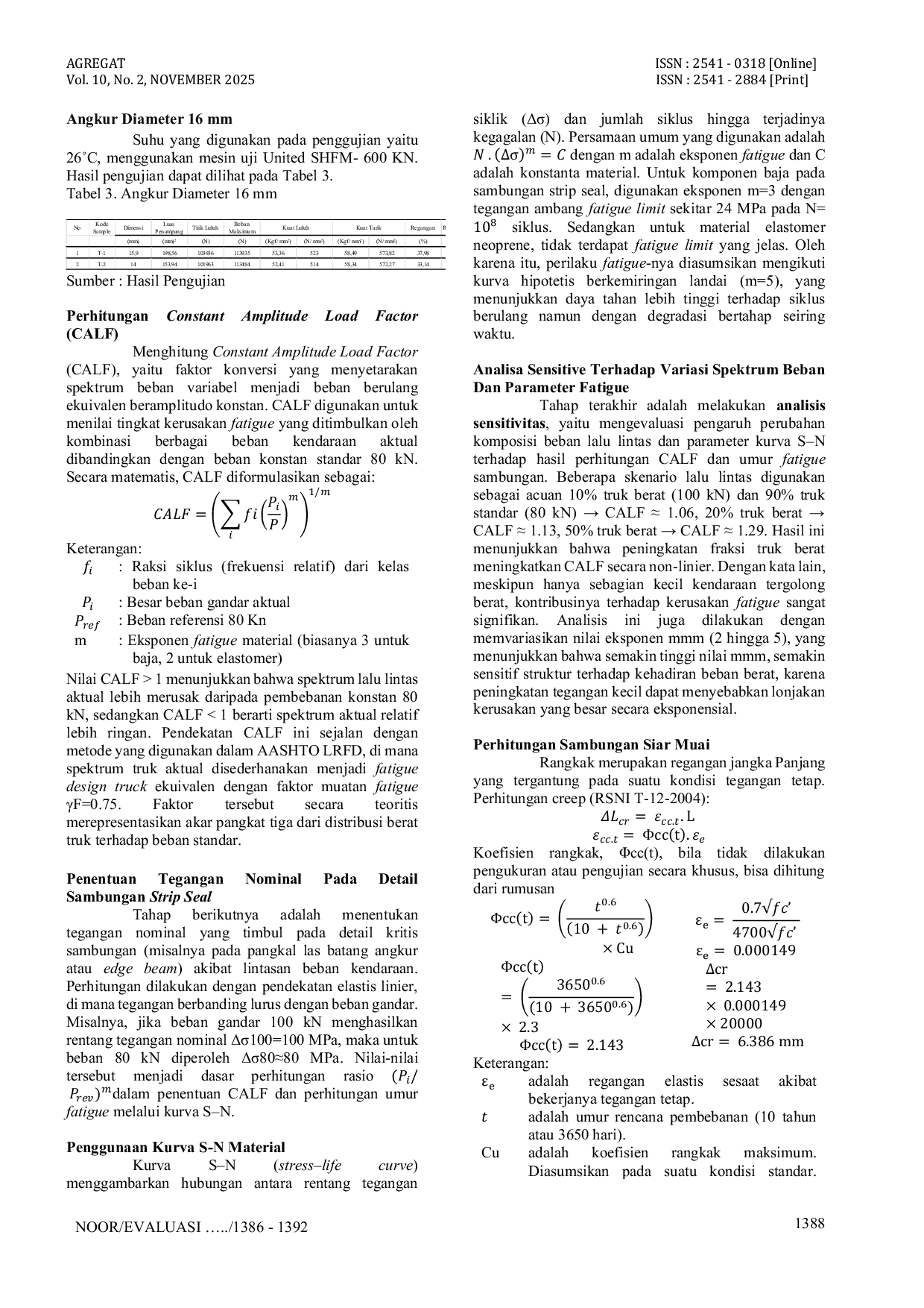AGREGATAGREGATSambungan siar muai tipe strip seal merupakan komponen struktural penting pada jembatan rangka baja modular yang berfungsi mengakomodasi pergerakan akibat ekspansi termal, deformasi struktural, serta pembebanan lalu lintas berulang. Dalam jangka panjang, komponen ini sangat dipengaruhi oleh mekanisme degradasi material yang bersifat kumulatif sehingga diperlukan evaluasi ketahanan fatigue untuk memastikan keandalannya. Penelitian ini menyajikan evaluasi komprehensif terhadap kinerja fatigue sambungan strip seal dengan mengimplementasikan pendekatan Constant Amplitude Load Factor (CALF), yaitu faktor koreksi yang mengonversi spektrum beban lalu lintas variabel menjadi pembebanan berulang dengan amplitudo konstan ekuivalen. Metodologi penelitian meliputi pemetaan beban lalu lintas ke dalam satuan Equivalent Single Axle Load (ESAL) dan spektrum gandar, perhitungan nilai CALF berdasarkan teori kumulatif Palmgren–Miner, serta penerapan kurva S–N (stress–life) pada material baja dan elastomer dengan eksponen fatigue yang berbeda. Selain itu, dilakukan analisis distribusi kontribusi kerusakan per kelas pembebanan untuk memperoleh gambaran sensitivitas komponen terhadap variasi intensitas lalu lintas berat. Hasil analisis menunjukkan bahwa sambungan strip seal memiliki ketahanan fatigue yang memadai pada kondisi pembebanan lalu lintas normal, namun peningkatan fraksi gandar berat secara signifikan mempercepat akumulasi kerusakan dan mempersingkat umur layan desain. Oleh karena itu menekankan pentingnya mempertimbangkan spektrum beban aktual melalui penerapan konsep CALF pada tahap perencanaan, disertai pengendalian kualitas detail pemasangan dan konstruksi guna mencegah terjadinya kegagalan pada sambungan siar muai.