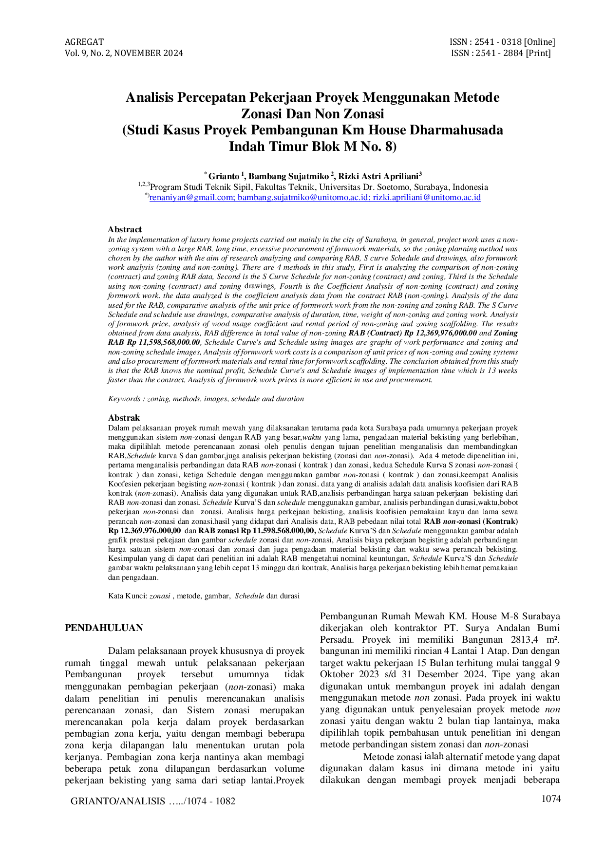 AGREGATAGREGATDalam pelaksanaan proyek rumah mewah yang dilaksanakan terutama pada kota Surabaya pada umumnya pekerjaan proyek menggunakan sistem non-zonasi dengan RAB yang besar,waktu yang lama, pengadaan material bekisting yang berlebihan, maka dipilihlah metode perencanaan zonasi oleh penulis dengan tujuan penelitian menganalisis dan membandingkan RAB,Schedule kurva S dan gambar,juga analisis pekerjaan bekisting (zonasi dan non-zonasi). Ada 4 metode dipenelitian ini, pertama menganalisis perbandingan data RAB non-zonasi ( kontrak ) dan zonasi, kedua Schedule Kurva S zonasi non-zonasi ( kontrak ) dan zonasi, ketiga Schedule dengan menggunakan gambar non-zonasi ( kontrak ) dan zonasi,keempat Analisis Koofesien pekerjaan begisting non-zonasi ( kontrak ) dan zonasi. data yang di analisis adalah data analisis koofisien dari RAB kontrak (non-zonasi). Analisis data yang digunakan untuk RAB,analisis perbandingan harga satuan pekerjaan bekisting dari RAB non-zonasi dan zonasi. Schedule KurvaS dan schedule menggunakan gambar, analisis perbandingan durasi,waktu,bobot pekerjaan non-zonasi dan zonasi. Analisis harga perkejaan bekisting, analisis koofisien pemakaian kayu dan lama sewa perancah non-zonasi dan zonasi.hasil yang didapat dari Analisis data, RAB pebedaan nilai total RAB non-zonasi (Kontrak) Rp 12.369.976.000,00 dan RAB zonasi Rp 11.598.568.000,00, Schedule KurvaS dan Schedule menggunakan gambar adalah grafik prestasi pekejaan dan gambar schedule zonasi dan non-zonasi, Analisis biaya pekerjaan begisting adalah perbandingan harga satuan sistem non-zonasi dan zonasi dan juga pengadaan material bekisting dan waktu sewa perancah bekisting. Kesimpulan yang di dapat dari penelitian ini adalah RAB mengetahui nominal keuntungan, Schedule KurvaS dan Schedule gambar waktu pelaksanaan yang lebih cepat 13 minggu dari kontrak, Analisis harga pekerjaan bekisting lebih hemat pemakaian dan pengadaan.