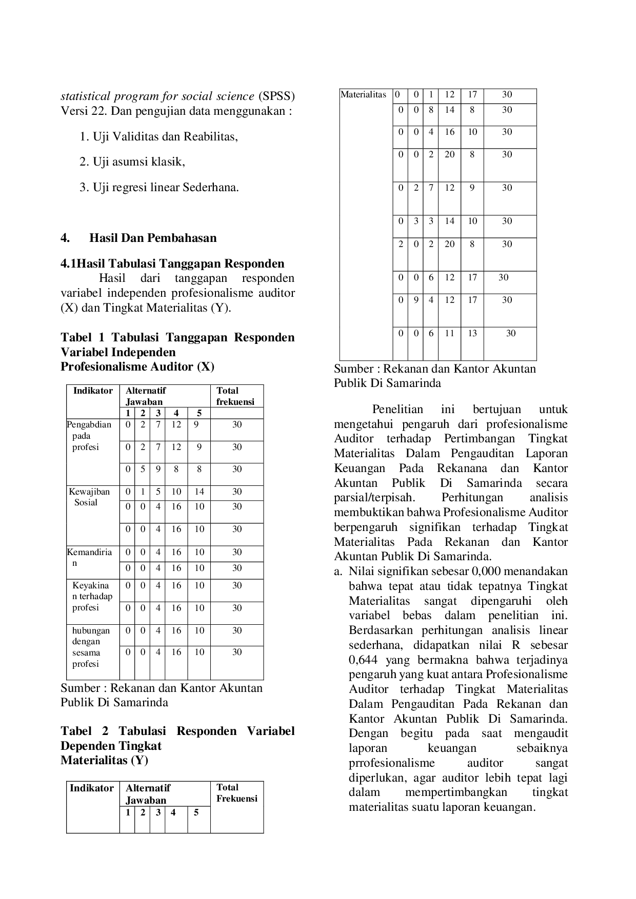 Berdasarkan penelitian yang telah dilakukan, dapat disimpulkan bahwa terdapat hubungan signifikan antara variabel Profesionalisme Auditor terhadap Tingkat Materialitas pada Rekanan dan Kantor Akuntan Publik di Samarinda.Hasil perhitungan uji t (Parsial) menunjukkan bahwa variabel independen Profesionalisme Auditor berpengaruh terhadap Tingkat Materialitas pada Rekanan dan Kantor Akuntan Publik Di Samarinda sehingga hipotesis diterima.Hubungan antara variabel Profesionalisme Auditor terhadap Tingkat Materialitas cukup kuat.Auditor sebaiknya selalu mempertimbangkan peraturan, perkembangan hukum maupun kasus – kasus yang terjadi di dalam atau di luar negeri untuk dapat selalu menjaga profesionalisme.
