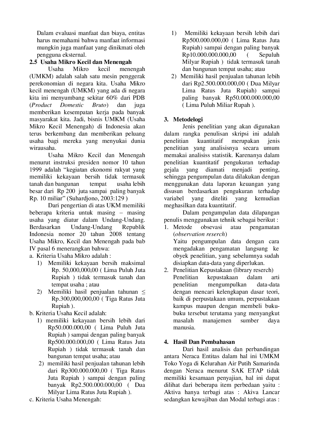 Berdasarkan analisis dan pembahasan, dapat disimpulkan bahwa pengakuan dalam penyajian neraca UMKM Toko Yoga di Kelurahan Air Putih Samarinda belum sesuai dengan penyajian neraca menurut SAK ETAP karena adanya perbedaan pengakuan aktiva.Pengukuran dalam penyajian laporan keuangan UMKM belum sesuai dengan standar pengukuran menurut SAK ETAP, khususnya pada aset tetap yang belum dilakukan pengukuran dengan baik.Penyajian yang kurang lengkap pada Laporan Neraca dan Laporan Laba Rugi UMKM Toko Yoga di Kelurahan Air Putih Samarinda harus diperbaiki agar dapat mempermudah pelaku bisnis dalam mengakui dan mengukur aset, kewajiban, penghasilan dan beban usahanya.