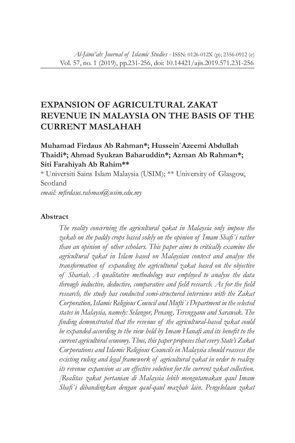 - Expansion of Agricultural Zakat Revenue in Malaysia on the Basis of the Current Maslahah | Ab Rahman... doi.org/10.14421/ajis.2019.571.231-256Expansion of Agricultural Zakat Revenue in Malaysia on the Basis of the Current Maslahah Ab Rahman doi 10 14421 ajis 2019 571 231 256
