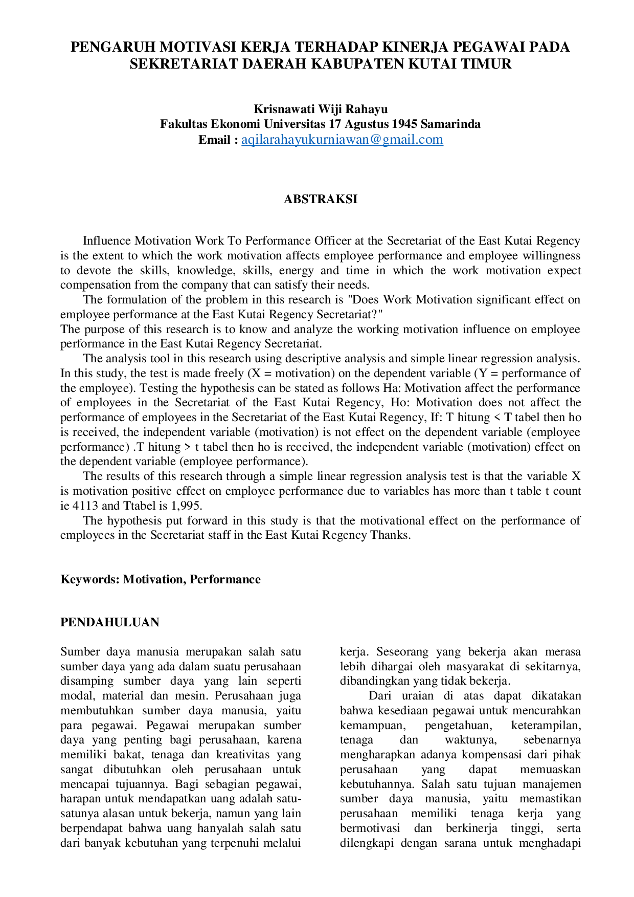 Hasil penelitian melalui uji analisis regresi linear sederhana menunjukkan bahwa variabel X, yaitu motivasi, berpengaruh positif terhadap kinerja pegawai.446 menunjukkan adanya hubungan kuat antara motivasi dan kinerja pegawai.199 menunjukkan bahwa 44,6% variasi kinerja pegawai dipengaruhi oleh variabel motivasi, sedangkan 55,4% dipengaruhi oleh variasi variabel lain.Hipotesis yang dikemukakan dalam penelitian, bahwa motivasi berpengaruh terhadap kinerja pegawai pada Sekretariat Daerah Kabupaten Kutai Timur, diterima.