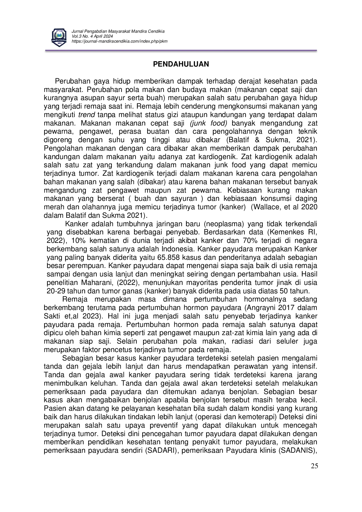 - SIAP DETEKSI DINI KANKER PAYUDARA PADA REMAJA PUTRI MELALUI KELAS PENDIDIKAN DAN PELATIHAN SADARI | Sakti... journal.ummat.ac.id/index.php/jmm/article/view/13771SIAP DETEKSI DINI KANKER PAYUDARA PADA REMAJA PUTRI MELALUI KELAS PENDIDIKAN DAN PELATIHAN SADARI Sakti journal ummat ac index php jmm article view 13771