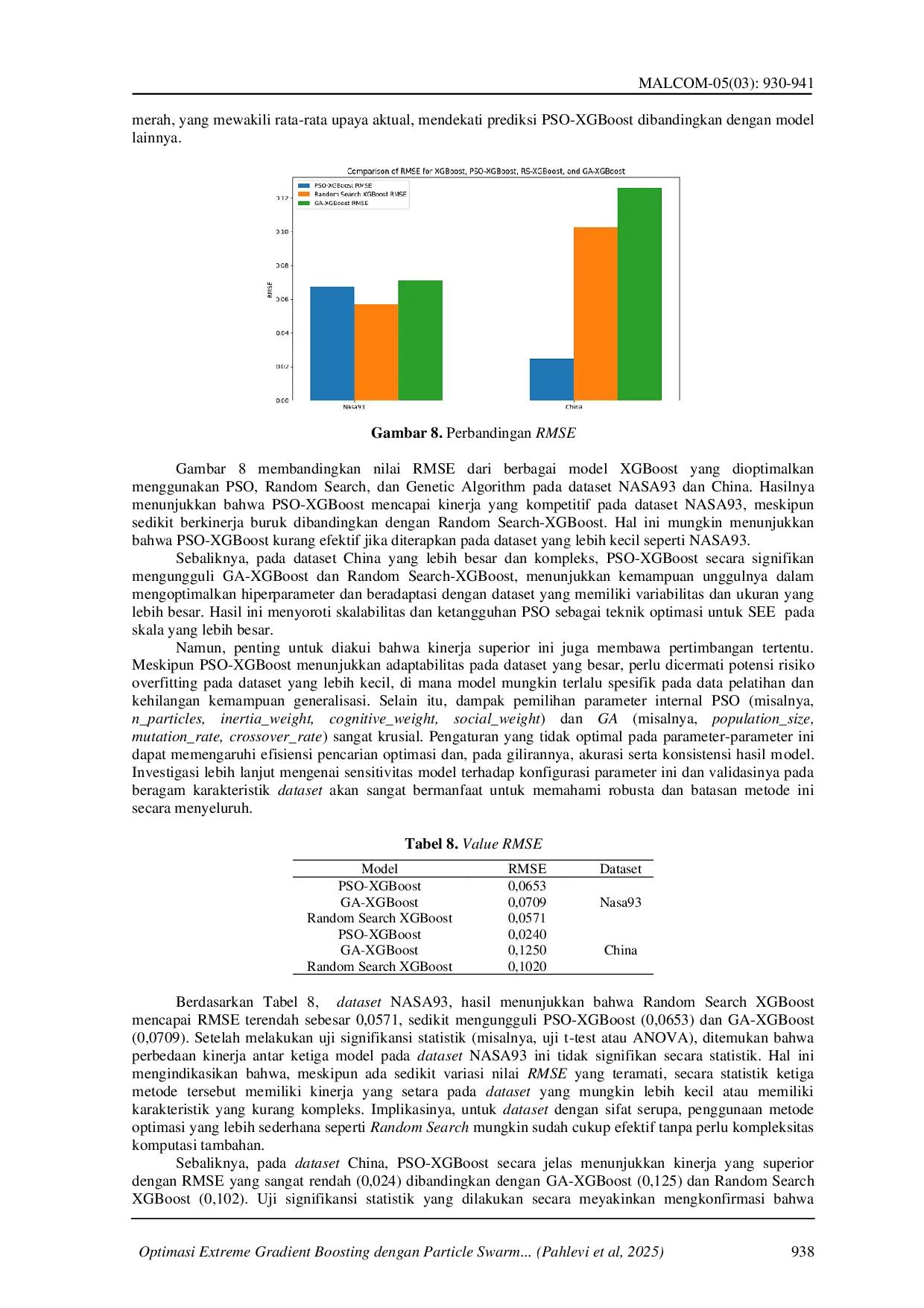 Penelitian ini mengevaluasi kinerja PSO dalam penyesuaian hiperparameter model XGBoost, membandingkannya dengan pendekatan optimasi Genetic Algorithm dan Random Search.Hasil eksperimen menunjukkan bahwa PSO-XGBoost secara konsisten menunjukkan kinerja yang kuat, terutama pada dataset yang lebih besar dan lebih kompleks.Meskipun PSO-XGBoost menunjukkan kinerja yang kompetitif pada dataset NASA93, namun sedikit lebih rendah dibandingkan Random Search-XGBoost.Pada dataset China, PSO-XGBoost secara signifikan mengungguli GA-XGBoost dan Random Search-XGBoost, mencapai RMSE sebesar 0,024.