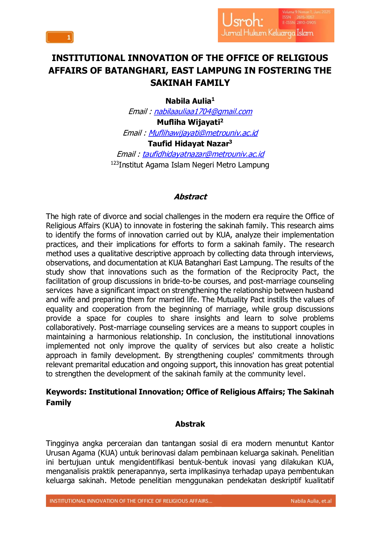 Usroh: Jurnal Hukum Keluarga IslamUsroh: Jurnal Hukum Keluarga IslamTingginya angka perceraian dan tantangan sosial di era modern menuntut Kantor Urusan Agama (KUA) untuk berinovasi dalam pembinaan keluarga sakinah. Penelitian ini bertujuan untuk mengidentifikasi bentuk-bentuk inovasi yang dilakukan KUA, menganalisis praktik penerapannya, serta implikasinya terhadap upaya pembentukan keluarga sakinah. Metode penelitian menggunakan pendekatan deskriptif kualitatif dengan pengumpulan data melalui wawancara, observasi, dan dokumentasi di KUA Batanghari Lampung Timur. Hasil penelitian menunjukkan bahwa inovasi seperti pembentukan Pakta Kesalingan, fasilitasi diskusi kelompok dalam kursus calon pengantin, dan layanan konsultasi pasca-pernikahan memberikan dampak signifikan dalam memperkuat hubungan suami istri serta mempersiapkan mereka menghadapi kehidupan pernikahan. Pakta Kesalingan menanamkan nilai-nilai kesetaraan dan kerja sama sejak awal pernikahan, sementara diskusi kelompok memberikan ruang bagi pasangan untuk berbagi wawasan dan belajar menyelesaikan masalah secara kolaboratif. Layanan konsultasi pasca-pernikahan menjadi sarana untuk mendukung pasangan dalam menjaga hubungan yang harmonis. Kesimpulannya, inovasi kelembagaan yang diterapkan tidak hanya meningkatkan kualitas layanan tetapi juga menciptakan pendekatan holistik dalam pembinaan keluarga. Dengan memperkuat komitmen pasangan melalui pendidikan pranikah yang relevan dan dukungan berkelanjutan, inovasi ini memiliki potensi besar untuk memperkuat pembinaan keluarga sakinah di tingkat masyarakat.