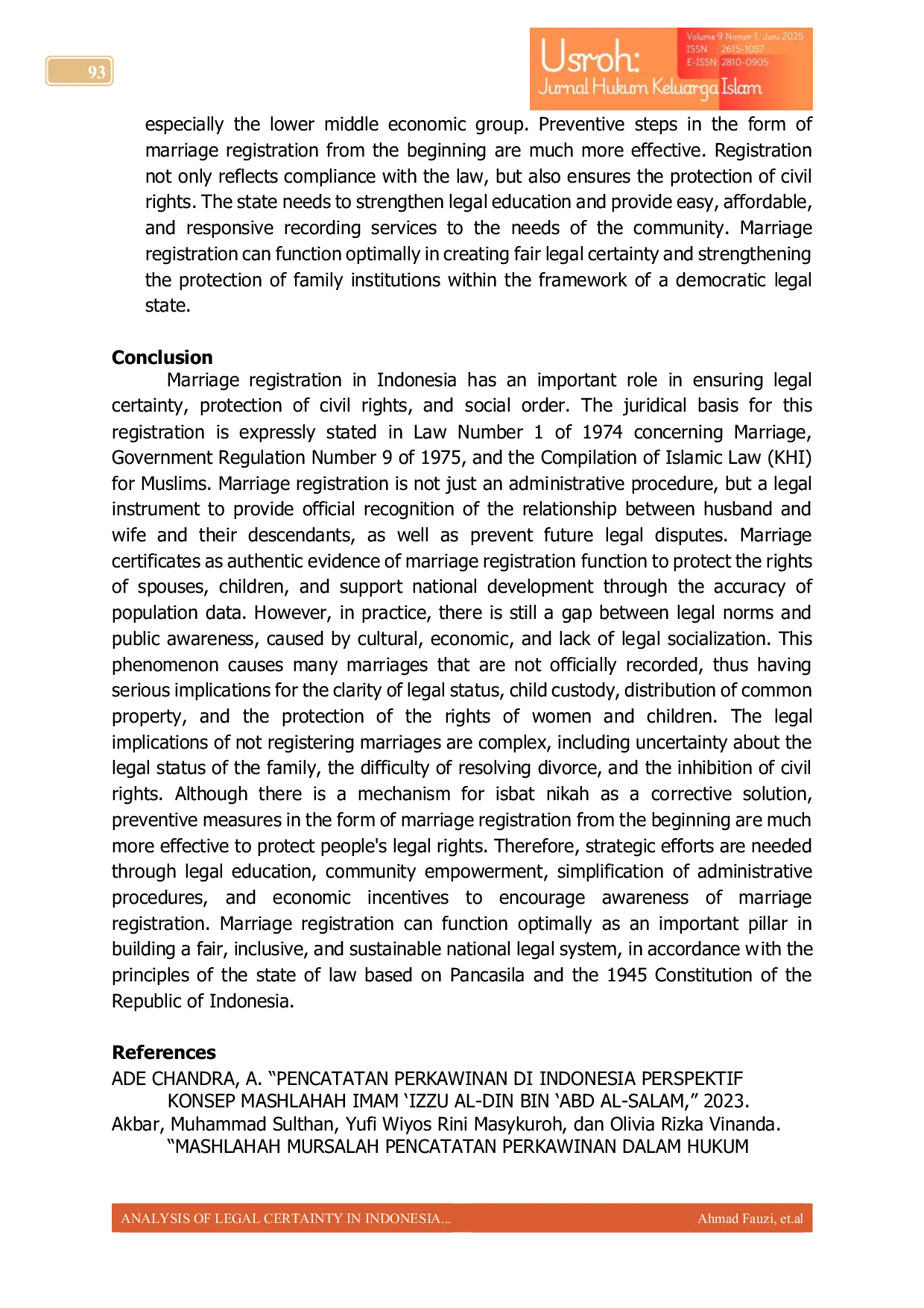 Marriage registration in Indonesia plays a crucial role in ensuring legal certainty, protecting civil rights, and maintaining social order.The juridical basis for this registration is explicitly stated in Law Number 1 of 1974 concerning Marriage, Government Regulation Number 9 of 1975, and the Compilation of Islamic Law (KHI) for Muslims.Marriage registration is not merely an administrative procedure but a legal instrument to provide official recognition of the relationship between husband and wife and their descendants, preventing future legal disputes.Marriage certificates, as authentic evidence of marriage registration, function to protect the rights of spouses, children, and support national development through accurate population data.However, there is still a gap between legal norms and public awareness, caused by cultural, economic, and lack of legal socialization factors.This phenomenon leads to many marriages not being officially recorded, resulting in serious implications for the clarity of legal status, child custody, distribution of common property, and the protection of womens and childrens rights.The legal implications of not registering marriages are complex, including uncertainty about the familys legal status, difficulty in resolving divorce, and inhibition of civil rights.While there is a mechanism for isbat nikah as a corrective solution, preventive measures through marriage registration from the beginning are more effective in protecting peoples legal rights.Therefore, strategic efforts are needed through legal education, community empowerment, simplification of administrative procedures, and economic incentives to promote awareness of marriage registration.Marriage registration can optimally function as an important pillar in building a fair, inclusive, and sustainable national legal system, in accordance with the principles of the state of law based on Pancasila and the 1945 Constitution of the Republic of Indonesia.