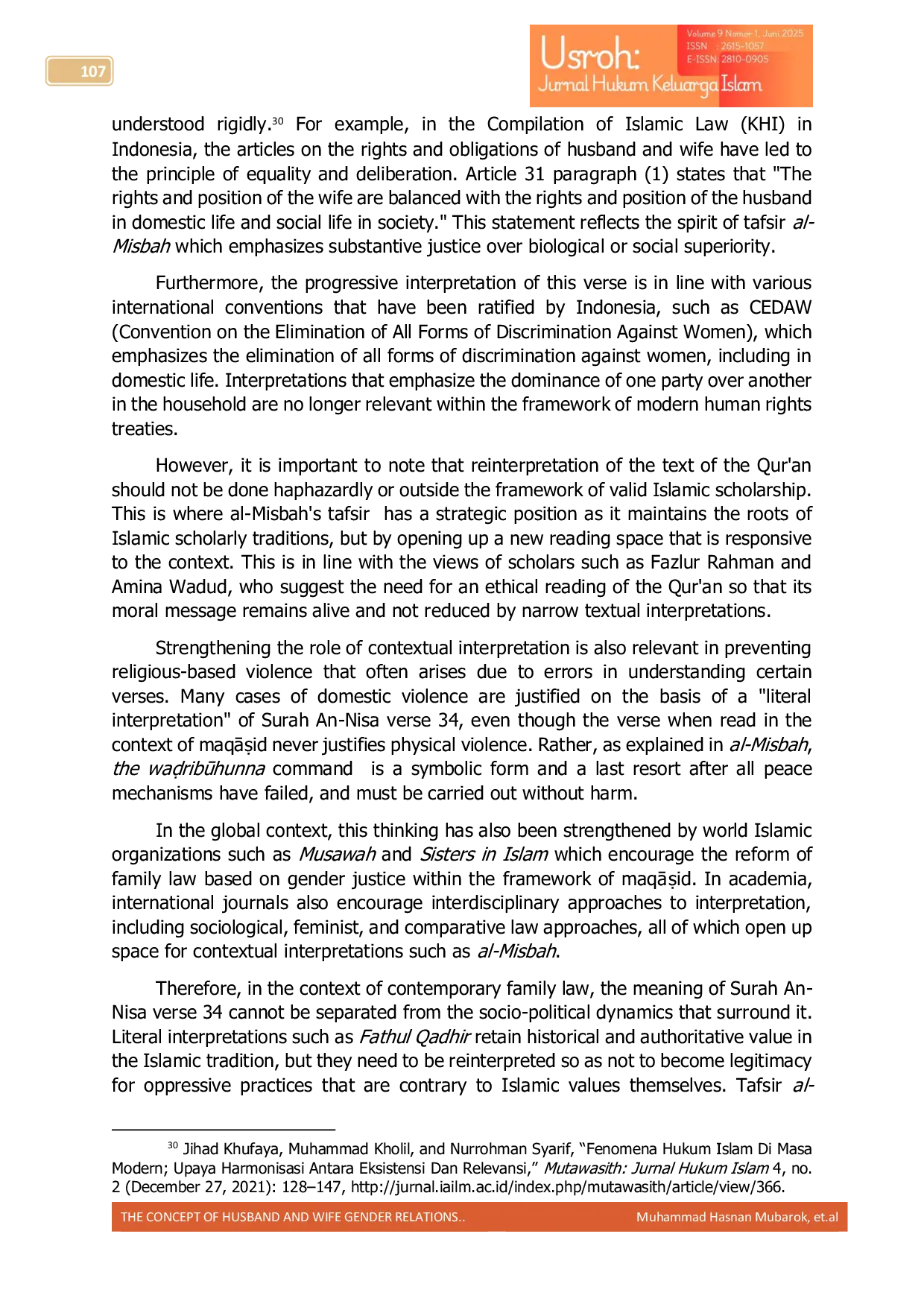 Penelitian ini menyimpulkan bahwa Tafsir al-Misbah dan Tafsir Fathul Qadhir sama-sama mengakui hak dan kewajiban suami istri dalam Surah An-Nisa ayat 34, dengan suami sebagai pemimpin dan penanggung nafkah, serta istri berperan dalam menjaga keharmonisan dan ketaatan.Tafsir al-Misbah menawarkan perspektif kontekstual dan fleksibel yang menekankan keadilan dan kasih sayang, sedangkan Tafsir Fathul Qadhir mempertahankan pendekatan literal dan tradisional yang berakar pada norma patriarkal.Dengan demikian, pendekatan kontekstual seperti yang diusung Al-Misbah lebih relevan untuk menjawab tantangan keluarga Muslim modern tanpa mengabaikan prinsip syariat Islam, sekaligus mendorong tafsir yang responsif demi mewujudkan hukum keluarga yang adil dan harmonis.