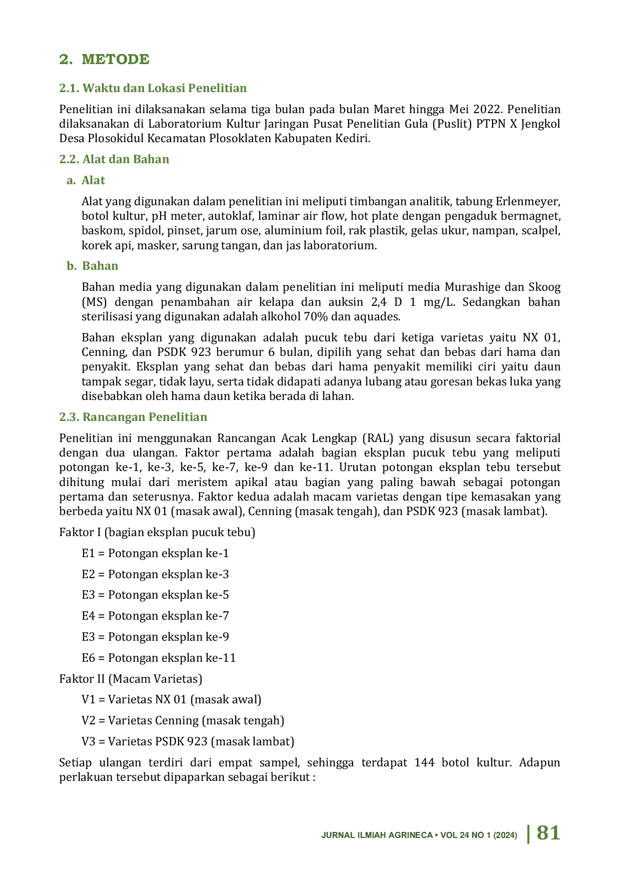 JURNAL ILMIAH AGRINECAJURNAL ILMIAH AGRINECAKultur jaringan adalah metode perbanyakan tanaman yang sesuai untuk menghasilkan benih unggul dalam jumlah besar dan sekaligus. Tujuan penelitian ini adalah untuk menentukan pengaruh pemilihan eksplan dan variasi pada induksi kalus tanaman tebu. Penelitian ini dilakukan dari Maret hingga Mei 2022 di Laboratorium Kultur Jaringan Pusat Penelitian Gula (Puslit) PTPN X Jengkol. Metode yang digunakan adalah Rancangan Acak Lengkap (RAL) dengan dua ulangan. Faktor pertama adalah bagian eksplan pucuk tebu (E) yang terdiri dari 6 tingkat, yaitu potongan ke-1, 3, 5, 7, 9, dan 11. Faktor kedua adalah jenis varietas dengan tipe kemasakan berbeda (V) yang terdiri dari 3 tingkat, yaitu NX 01 (masak awal), Cenning (masak tengah), dan PSDK 923 (masak lambat). Berdasarkan analisis data, kombinasi perlakuan eksplan pucuk tebu (E) dan varietas (V) menunjukkan respons positif terhadap variabel waktu munculnya kalus, dengan kombinasi potongan eksplan ke-1 pada varietas NX 01 memiliki waktu muncul tercepat yaitu 6,5 hari. Perlakuan eksplan pucuk tebu (E) memiliki pengaruh sangat signifikan terhadap variabel persentase kontaminasi. Persentase kontaminasi terendah teramati pada potongan ke-11 sebesar 8,35%.