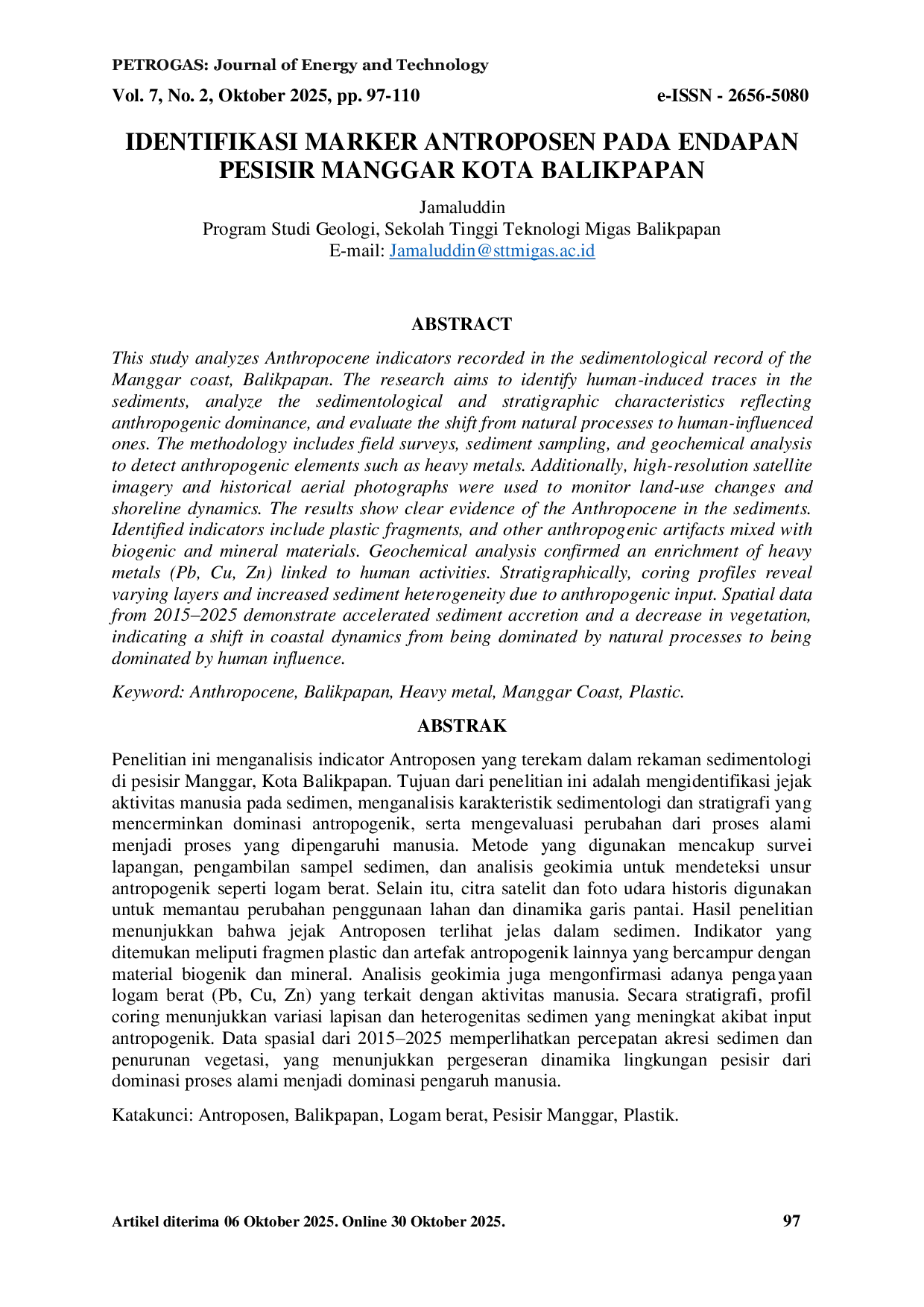 PETROGAS: Journal of Energy and TechnologyPETROGAS: Journal of Energy and TechnologyPenelitian ini menganalisis indikator Antroposen yang terekam dalam rekaman sedimentologi di pesisir Manggar, Kota Balikpapan. Tujuan dari penelitian ini adalah mengidentifikasi jejak aktivitas manusia pada sedimen, menganalisis karakteristik sedimentologi dan stratigrafi yang mencerminkan dominasi antropogenik, serta mengevaluasi perubahan dari proses alami menjadi proses yang dipengaruhi manusia. Metode yang digunakan mencakup survei lapangan, pengambilan sampel sedimen, dan analisis geokimia untuk mendeteksi unsur antropogenik seperti logam berat. Selain itu, citra satelit dan foto udara historis digunakan untuk memantau perubahan penggunaan lahan dan dinamika garis pantai. Hasil penelitian menunjukkan bahwa jejak Antroposen terlihat jelas dalam sedimen. Indikator yang ditemukan meliputi fragmen plastik dan artefak antropogenik lainnya yang bercampur dengan material biogenik dan mineral. Analisis geokimia juga mengonfirmasi adanya pengayaan logam berat (Pb, Cu, Zn) yang terkait dengan aktivitas manusia. Secara stratigrafi, profil coring menunjukkan variasi lapisan dan heterogenitas sedimen yang meningkat akibat input antropogenik. Data spasial dari 2015–2025 memperlihatkan percepatan akresi sedimen dan penurunan vegetasi, yang menunjukkan pergeseran dinamika lingkungan pesisir dari dominasi proses alami menjadi dominasi pengaruh manusia.