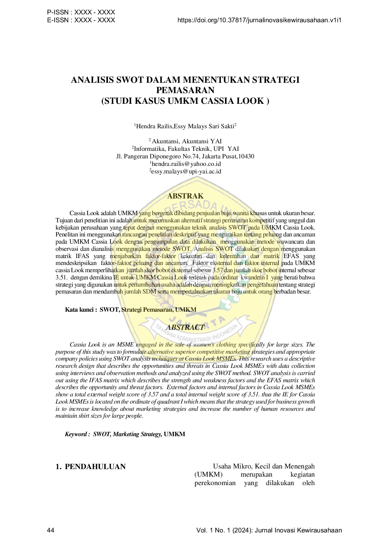 Jurnal Inovasi KewirausahaanJurnal Inovasi KewirausahaanCassia Look adalah UMKM yang bergerak dibidang penjualan baju wanita khusus untuk ukuran besar. Tujuan dari penelitian ini adalah untuk merumuskan alternatif strategi pemasaran kompetitif yang unggul dan kebijakan perusahaan yang tepat dengan menggunakan teknik analisis SWOT pada UMKM Cassia Look. Penelitan ini menggunakan rancangan penelitian deskriptif yang menguraikan tentang peluang dan ancaman pada UMKM Cassia Look dengan pengumpulan data dilakukan menggunakan metode wawancara dan observasi dan dianalisis menggunakan metode SWOT. Analisis SWOT dilakukan dengan menggunakan matrik IFAS yang menjabarkan faktor-faktor kekuatan dan kelemahan dan matrik EFAS yang mendeskripsikan faktor-faktor peluang dan ancaman. Faktor eksternal dan faktor internal pada UMKM Cassia Look memperlihatkan jumlah skor bobot eksternal sebesar 3.57 dan jumlah skor bobot internal sebesar 3.51. dengan demikina IE untuk UMKM Cassia Look terletak pada ordinat kwandran I yang berati bahwa strategi yang digunakan untuk pertumbuhan usaha adalah dengan meningkatkan pengetahuan tentang strategi pemasaran dan mendambah jumlah SDM serta mempertahankan ukuran baju untuk orang berbadan besar.