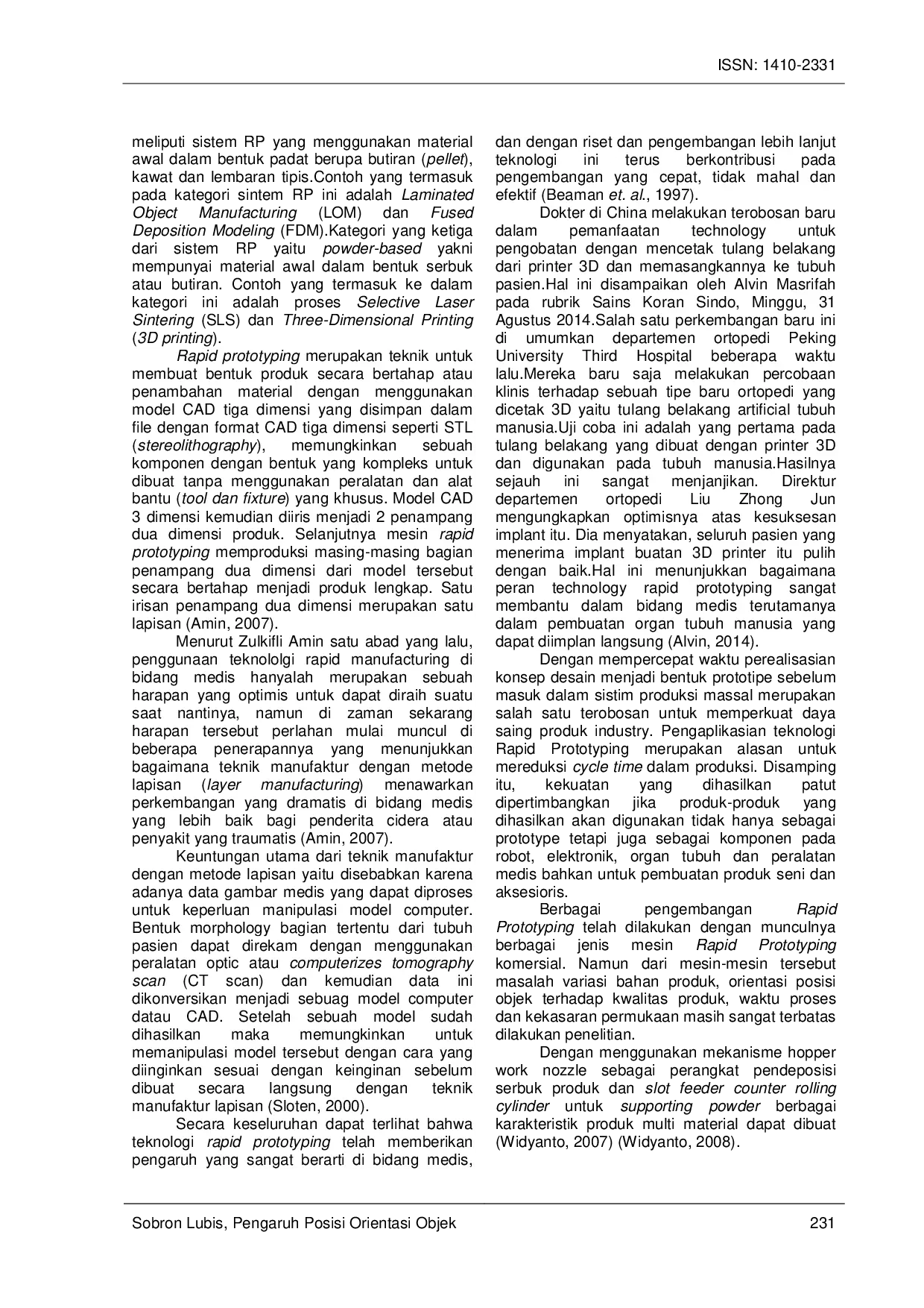 SINERGISINERGIPembuatan prototipe pada industri manufaktur berkembang dengan pesat, berawal dari pembuatan secara konvensional, kemudian dilakukan dengan menggunakan mesin-mesin perkakas, dan berkembang dengan pemanfaatan komputer sebagai alat kontrol pada mesin tersebut sehingga dikenal dengan istilah CNC (computer numerically control). Pada awalnya, pembuatan prototipe dilakukan menggunakan mesin perkakas yang membentuk kontur permukaan dengan melakukan pemotongan pada benda kerja, tentunya dalam hal ini terdapat bahan tersisa yang dikenal dengan chip. Dewasa ini perkembangan dalam pembuatan prototipe maju dengan pesat yang dikenal dengan pembuatan prototipe cepat (rapid prorotyping). Keunggulan dari rapid prototyping dalam bidang manufaktur adalah kemudahannya dalam menghasilkan suatu produk yang kompleks dengan tepat dan efisien. Proses rapid prototyping mampu merealisasikan hasil permodelan 3D software dalam bentuk nyata tanpa intervensi apapun. Dalam penelitian ini, dikaji tentang pengaruh penentuan posisi orientasi secara vertical dan horizontal terhadap kekuatan Tarik material polymer yang digunakan. Penelitian dilakukan dengan dengan menggunakan perangkat rapid prototyping tipe fused deposition modeling yakni 3D printing. Bahan filament yang digunakan jenis polymer PLA dan ABS. Proses printing dilakukan terhadap bentuk objek uji Tarik ASTM D638. Proses 3D printing dilakukan dengan memvariasikan posisi orientasi objek secara vertikal dan horizontal. Spesimen yang dihasilkan selanjutnya dilakukan uji tarik. Berdasarkan hasil pengujian yang dilakukan dapat diketahui bahwa penentuan orientasi posisi objek spesimen memberi pengaruh terhadap tegangan tarik spesimen.