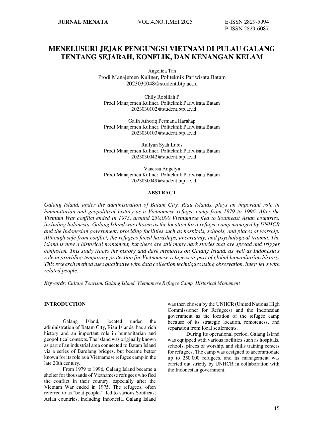 JURNAL MENATAJURNAL MENATAPulau Galang, yang berada di bawah administrasi Kota Batam, Kepulauan Riau, memiliki peran penting dalam sejarah kemanusiaan dan konteks geopolitik. Pulau ini awalnya dikenal sebagai bagian dari kawasan industri yang terhubung dengan Pulau Batam melalui serangkaian Jembatan Barelang, tetapi menjadi lebih dikenal karena perannya sebagai kamp pengungsi Vietnam pada akhir abad ke-20. Dari tahun 1979 hingga 1996, Pulau Galang menjadi tempat perlindungan bagi ribuan pengungsi Vietnam yang melarikan diri dari konflik di negara mereka, terutama setelah berakhirnya Perang Vietnam pada tahun 1975. Pengungsi, yang sering disebut sebagai orang-orang perahu, melarikan diri ke berbagai negara Asia Tenggara, termasuk Indonesia. Pulau Galang kemudian dipilih oleh UNHCR (United Nations High Commissioner for Refugees) dan pemerintah Indonesia sebagai lokasi kamp pengungsi karena lokasinya yang strategis, terisolasi, dan terpisah dari permukiman lokal. Selama masa operasinya, Pulau Galang dilengkapi dengan berbagai fasilitas seperti rumah sakit, sekolah, tempat ibadah, dan pusat pelatihan keterampilan untuk pengungsi. Kamp dirancang untuk menampung hingga 250.000 pengungsi, dan pengelolaannya dilakukan secara ketat oleh UNHCR bekerja sama dengan pemerintah Indonesia.