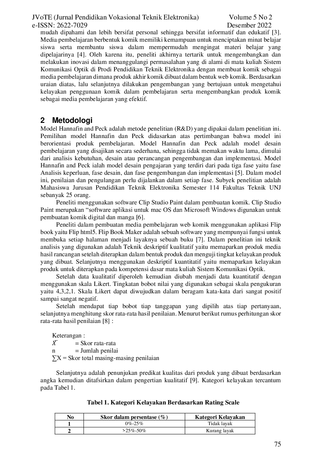 JURNAL PENDIDIKAN VOKASIONAL TEKNIK ELEKTRONIKA (JVoTE)JURNAL PENDIDIKAN VOKASIONAL TEKNIK ELEKTRONIKA (JVoTE)Penelitian ini bertujuan untuk mengembangkan media pembelajaran komik pada mata kuliah Sistem Komunikasi Optik untuk mahasiswa Prodi Pendidikan Teknik Elektronika Universitas Negeri Jakarta, serta menguji tingkat kelayakan berdasarkan ahli materi, ahli media dan mahasiswa. Penelitian ini menggunakan metode Research and Development (RnD) dengan model Hannafin and Peck yang meliputi; 1) Analisis keperluan, 2) Desain, 3) Pengembangan dan Implementasi. Hasil pengembangan media pembelajaran komik pada mata kuliah Sistem Komunikasi optik digunakan pada materi Standar, Arsitektur dan Kalkulasi Daya GPON, Backhaul GPON untuk LTE/LTE-A, dan GPON sebagai Backhaul 5G. Hasil dari penelitian dan pengembangan yaitu 1) media pembelajaran komik pada mata kuliah Sistem Komunikasi Optik untuk mahasiswa Prodi Pendidikan Teknik Elektronika UNJ yang telah dikembangkan berdasarkan metode Research and Development (RnD) dengan model Hannafin and Peck. 2) Hasil uji kelayakan oleh ahli materi memperoleh persentase penilaian sebesar 81,6% artinya produk sangat layak. 3) Hasil uji kelayakan oleh ahli media memperoleh persentase penilaian sebesar 95,6% artinya produk sangat layak. 4) uji coba lapangan kepada mahasiswa Prodi Pendidikan Teknik Elektronika UNJ di mata kuliah Sistem Komunikasi Optik memperoleh persentase penilaian sebesar 85%. Berdasarkan kategori kelayakan, dapat disimpulkan bahwa media pembelajaran komik yang dikembangkan pada mata kuliah Sistem Komunikasi Optik dapat dikategorikan sangat layak untuk digunakan sebagai media pembelajaran.