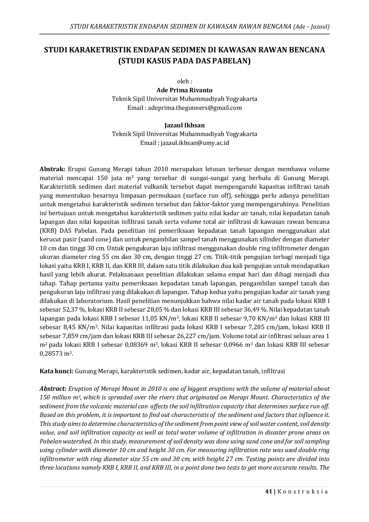 KonstruksiaKonstruksiaErupsi Gunung Merapi tahun 2010 merupakan letusan terbesar dengan membawa volume material mencapai 150 juta m3 yang tersebar di sungai-sungai yang berhulu di Gunung Merapi. Karakteristik sedimen dari material vulkanik tersebut dapat mempengaruhi kapasitas infiltrasi tanah yang menentukan besarnya limpasan permukaan (surface run off), sehingga perlu adanya penelitian untuk mengetahui karakteristik sedimen tersebut dan faktor-faktor yang mempengaruhinya. Penelitian ini bertujuan untuk mengetahui karakteristik sedimen yaitu nilai kadar air tanah, nilai kepadatan tanah lapangan dan nilai kapasitas infiltrasi tanah serta volume total air infiltrasi di kawasan rawan bencana (KRB) DAS Pabelan. Pada penelitian ini pemeriksaan kepadatan tanah lapangan menggunakan alat kerucut pasir (sand cone) dan untuk pengambilan sampel tanah menggunakan silinder dengan diameter 10 cm dan tinggi 30 cm. Untuk pengukuran laju infiltrasi menggunakan double ring infiltrometer dengan ukuran diameter ring 55 cm dan 30 cm, dengan tinggi 27 cm. Titik-titik pengujian terbagi menjadi tiga lokasi yaitu KRB I, KRB II, dan KRB III, dalam satu titik dilakukan dua kali pengujian untuk mendapatkan hasil yang lebih akurat. Pelaksanaan penelitian dilakukan selama empat hari dan dibagi menjadi dua tahap. Tahap pertama yaitu pemeriksaan kepadatan tanah lapangan, pengambilan sampel tanah dan pengukuran laju infiltrasi yang dilakukan di lapangan. Tahap kedua yaitu pengujian kadar air tanah yang dilakukan di laboratorium. Hasil penelitian menunjukkan bahwa nilai kadar air tanah pada lokasi KRB I sebesar 52,37 %, lokasi KRB II sebesar 28,05 % dan lokasi KRB III sebesar 36,49 %. Nilai kepadatan tanah lapangan pada lokasi KRB I sebesar 11,05 KN/m3, lokasi KRB II sebesar 9,70 KN/m3 dan lokasi KRB III sebesar 8,45 KN/m3. Nilai kapasitas infiltrasi pada lokasi KRB I sebesar 7,285 cm/jam, lokasi KRB II sebesar 7,859 cm/jam dan lokasi KRB III sebesar 26,227 cm/jam. Volume total air infiltrasi seluas area 1 m2 pada lokasi KRB I sebesar 0,08369 m3, lokasi KRB II sebesar 0,0966 m3 dan lokasi KRB III sebesar 0,28573 m3.