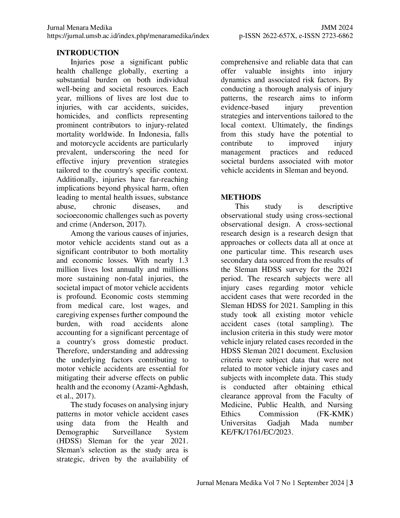 Menara MedikaMenara MedikaLatar Belakang: Analisis pola cedera penting untuk mencegah penurunan produktivitas dan kualitas hidup. Setiap tahun, ribuan nyawa melayang akibat kecelakaan kendaraan bermotor. Data HDSS Sleman 2021 digunakan dalam studi ini untuk mendukung pengembangan ilmiah di bidang kesehatan. HDSS bertujuan membangun situs surveilans, menghasilkan data berkualitas, dan mendukung pelayanan masyarakat yang berbasis bukti. Masalah: Terdapat banyak kasus kecelakaan lalu lintas berdasarkan data HDSS Sleman tahun 2021 sehingga penting untuk menganalisis pola cedera yang terjadi. Tujuan: Penelitian akan dilakukan untuk menentukan . Metode: Studi observasional deskriptif menggunakan metode cross-sectional. Hasil: Total sampel studi ini adalah 302 orang. Dominasi jenis kelamin pada kasus kecelakaan kendaraan bermotor adalah pada laki-laki (62%). Mayoritas ditemukan pada rentang usia 25-64 tahun (55%). Dari 302 sampel, prevalensi tertinggi lokasi cedera pada tubuh korban adalah ekstremitas bawah dan yang terendah adalah perut/organ internal. Prevalensi tertinggi jenis cedera adalah memar dan yang terendah adalah putus anggota tubuh, gegar otak, dan luka bakar.