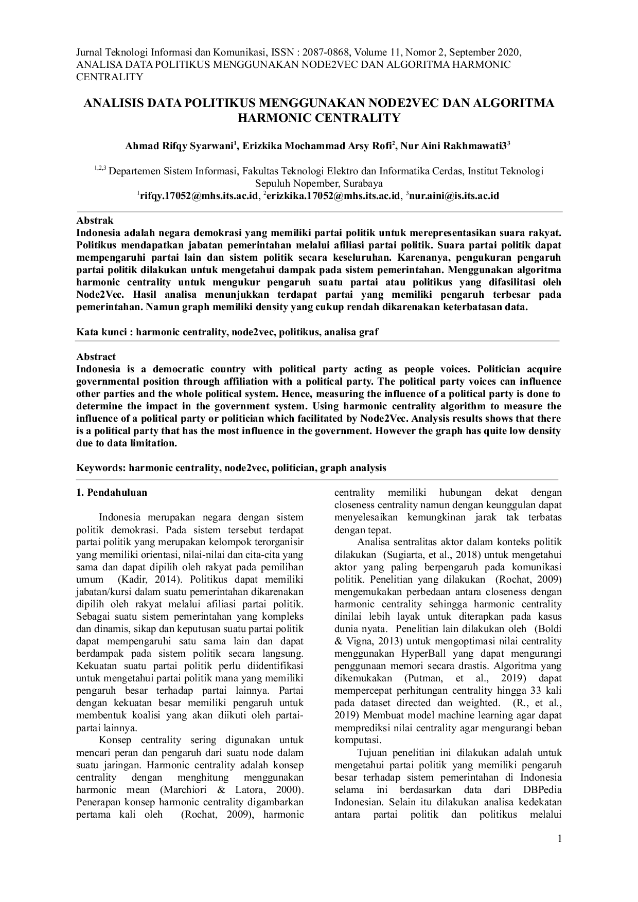 JURNAL TEKNOLOGI INFORMASI DAN KOMUNIKASIJURNAL TEKNOLOGI INFORMASI DAN KOMUNIKASIIndonesia adalah negara demokrasi yang memiliki partai politik untuk merepresentasikan suara rakyat. Politikus mendapatkan jabatan pemerintahan melalui afiliasi partai politik. Suara partai politik dapat mempengaruhi partai lain dan sistem politik secara keseluruhan. Karenanya, pengukuran pengaruh partai politik dilakukan untuk mengetahui dampak pada sistem pemerintahan. Menggunakan algoritma harmonic centrality untuk mengukur pengaruh suatu partai atau politikus yang difasilitasi oleh Node2Vec. Hasil analisa menunjukkan terdapat partai yang memiliki pengaruh terbesar pada pemerintahan. Namun graph memiliki density yang cukup rendah dikarenakan keterbatasan data.