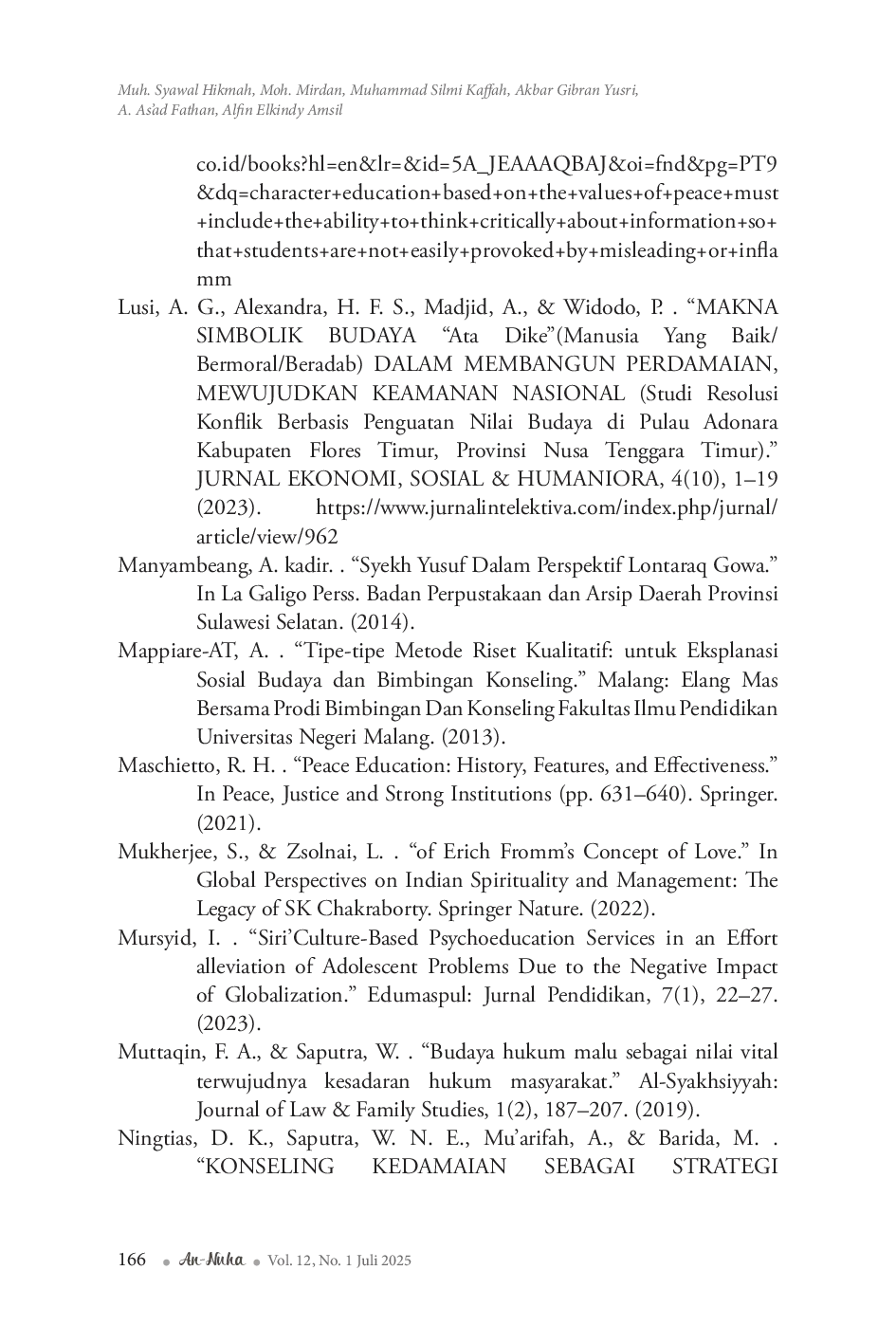 An-Nuha : Jurnal Kajian Islam, Pendidikan, Budaya dan SosialAn-Nuha : Jurnal Kajian Islam, Pendidikan, Budaya dan SosialTujuan dari penelitian ini adalah menelisik nilai-nilai karakter damai pada riwayat hidup Syekh Yusuf Al-Makassari dalam perspektif lontaraq Gowa dan bagimana implikasi nilai-nilai karakter damai Syekh Yusuf terhadap bimbingan dan konseling. Penelitian ini menggunakan pendekatan kualitatif dengan metode riset hermeneutika Gadamerian, yang menekankan pada proses analisis antara bagian dan keseluruhan (part and whole) dalam upaya memahami serta memberi makna terhadap teks. Dari hasil penelitian ditemukan terdapat tujuh nilai karakter damai Syekh Yusuf yang meliputi nikatutuinna dan ningainna (menyanyangi dan disukai), kamaseang (peduli dan menyanyangi), mallaq dan masiriq (takut dan malu), paqrasangang matangkasaka (mencari kebenaran), bantui na tamaka-makai rannuna pagmaiqna taua (membantu membuat hati seorang senang), tamasalai (tidak menyakahkan), napassamaturuki (musyawarah mufakat), pamopporang (memaafkan). Adapun implikasi nilai-nilai karakter damai Syekh Yusuf pada layanan bimbingan dan konseling dalam penelitian ini teridentifikasi dalam layanan dasar bidang bimbingan pribadi dan sosial.