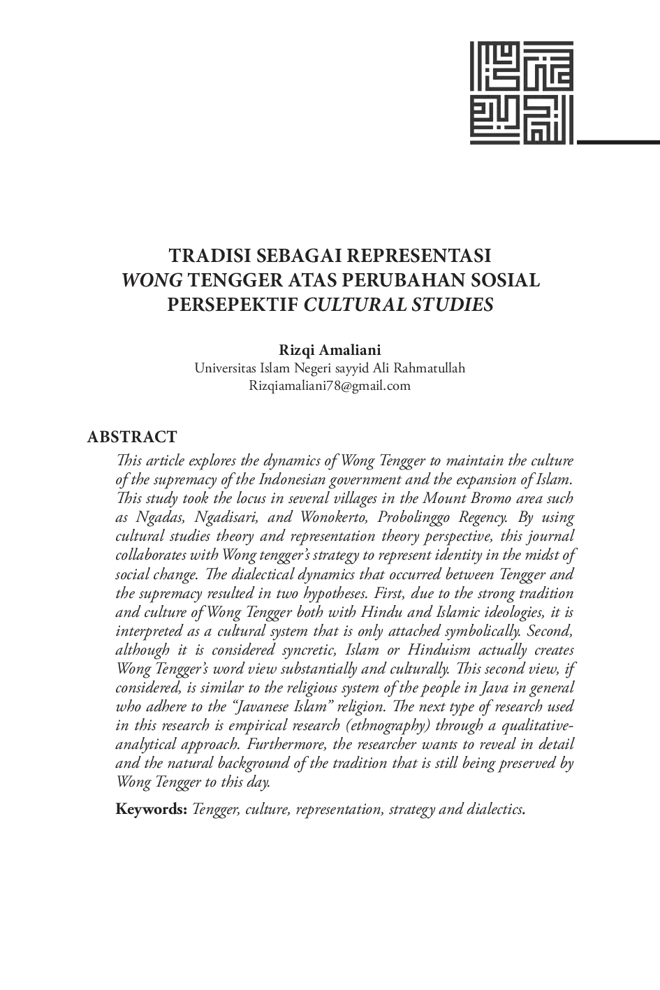 An-Nuha : Jurnal Kajian Islam, Pendidikan, Budaya dan SosialAn-Nuha : Jurnal Kajian Islam, Pendidikan, Budaya dan SosialArtikel ini mengeksplorasi terhadap dinamika Wong Tengger untuk mempertahankan budaya dari supremasi pemerintah Indonesia serta ekspansi Islam. Penelitian ini mengambil lokus di beberapa desa yang ada di kawasan Gunung Bromo seperti Ngadas, Ngadisari, dan Wonokerto, Kabupaten Probolinggo. Dengan menggunakan teori Cultural Studies dan perspektif teori representasi, jurnal ini mengkolaborasi strategi Wong Tengger mempresentasikan identitas di tengah-tengah perubahan sosial. Dinamika dialektika yang terjadi di antara Tengger dengan supremasi menghasilkan dua hipotesis. Pertama, akibat kuatnya tradisi dan kebudayaan Wong Tengger baik dengan ideologi Hindu maupun Islam, diartikan sebagai sistem kebudayaan yang hanya melekat secara simbolik. Kedua, meskipun dianggap sinkretis, sebenarnya Islam ataupun Hindu menciptakan worldview Wong Tengger secara substantif dan kultural. Pandangan kedua ini, bila diperhatikan, mirip dengan sistem keagamaan masyarakat di Jawa pada umumnya yang menganut agama Islam “Islam Jawa. Selanjutnya jenis penelitian yang digunakan dalam penelitian ini adalah penelitian empiris (etnografi) melalui pendekatan kualitatif‑analitis. Lebih lanjut, peneliti ingin mengungkap secara detail dan berlatar alamiah tradisi yang masih dilestarikan oleh Wong Tengger hingga saat ini.